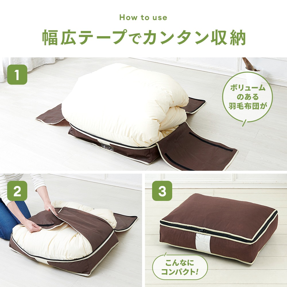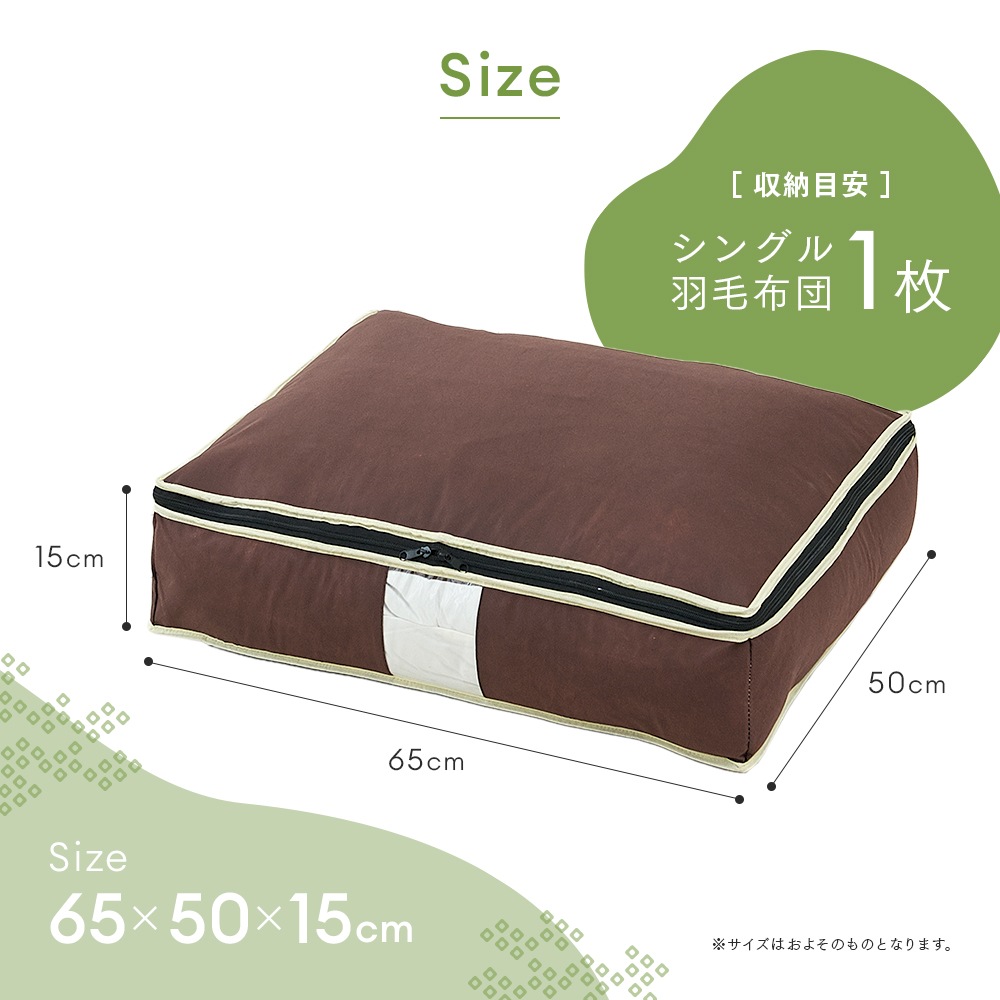 | 炭加工シートを挟んだ3層構造収納ケースで、気になる汗のニオイ・加齢臭を消臭!クローゼットのすき間にタテ収納!シングル用サイズの羽毛布団収納ケース。幅広テープで手間をかけずスッキリ収納!透明窓から中身が見える。普段使わない来客用の布団にも。※炭加工シートは底面(キルト面)に使用しております。 |