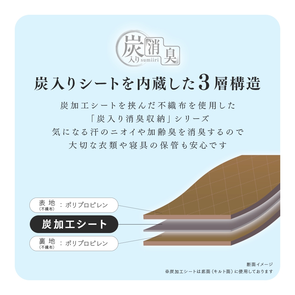 | 炭加工シートを挟んだ3層構造収納ケースで、気になる汗のニオイ・加齢臭を消臭!クローゼットのすき間にタテ収納!ダブル用サイズの羽毛布団収納ケース。幅広テープで手間をかけずスッキリ収納!透明窓から中身が見える。普段使わない来客用の布団にも。※炭加工シートは底面(キルト面)に使用しております。 |