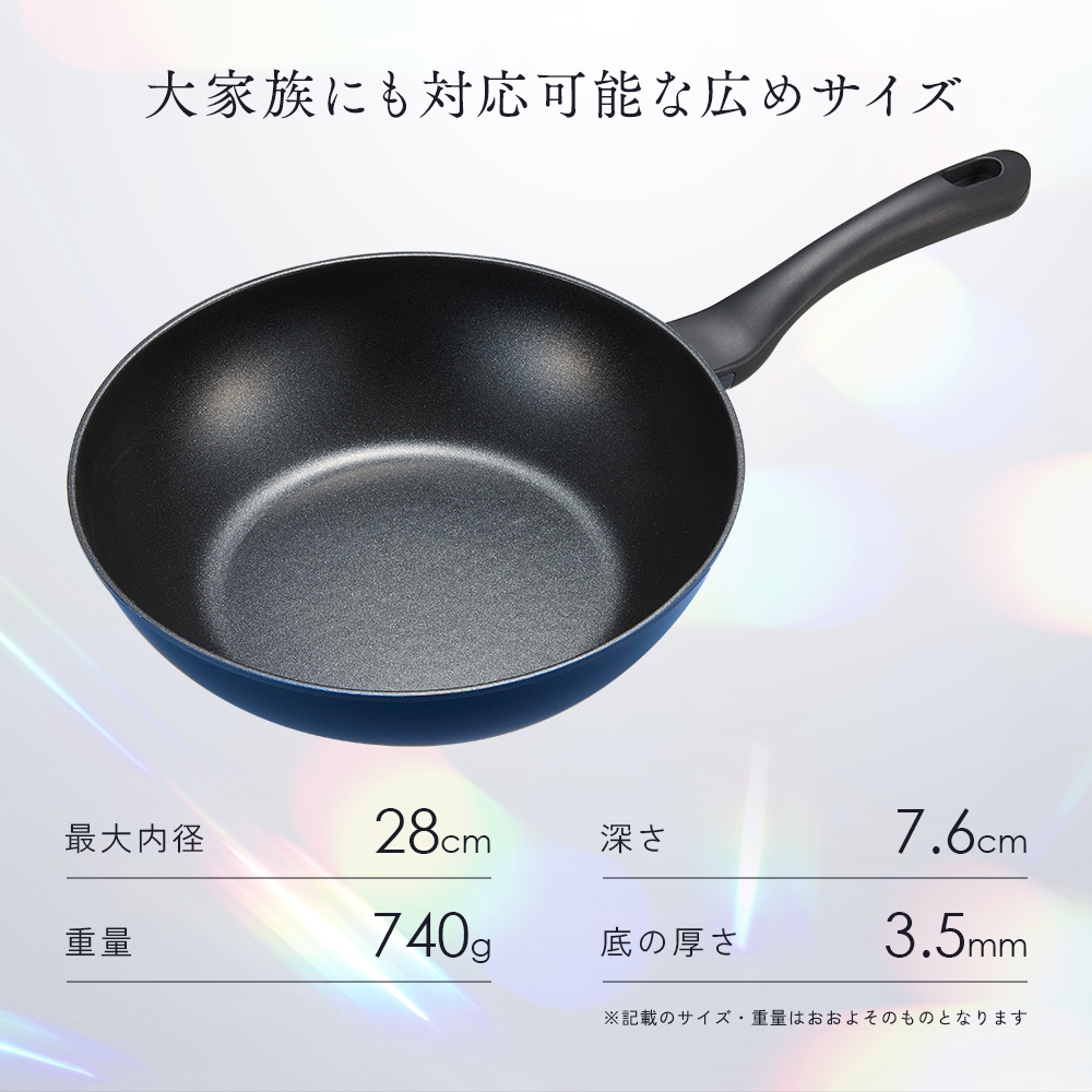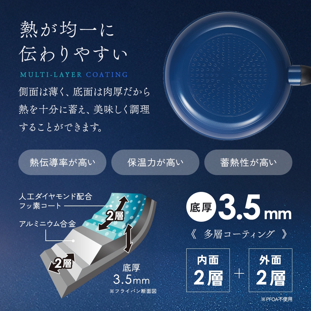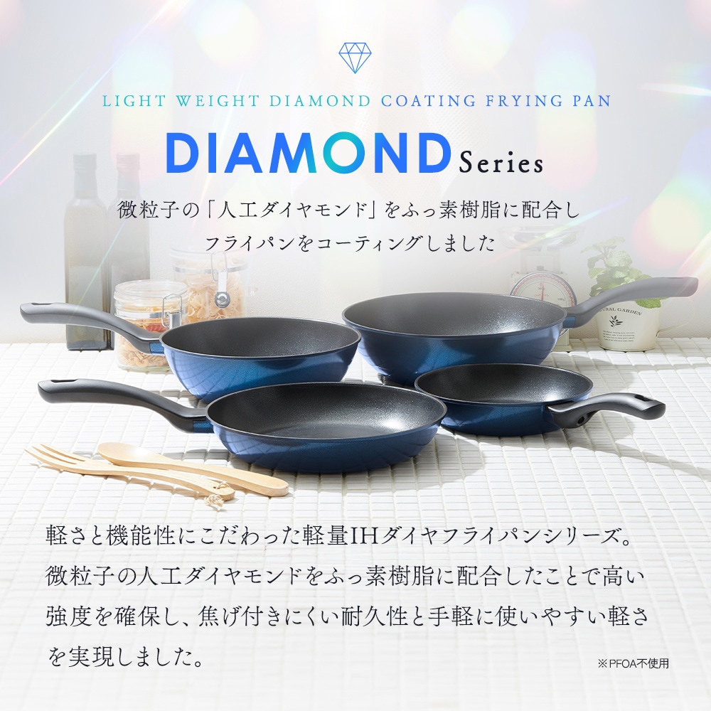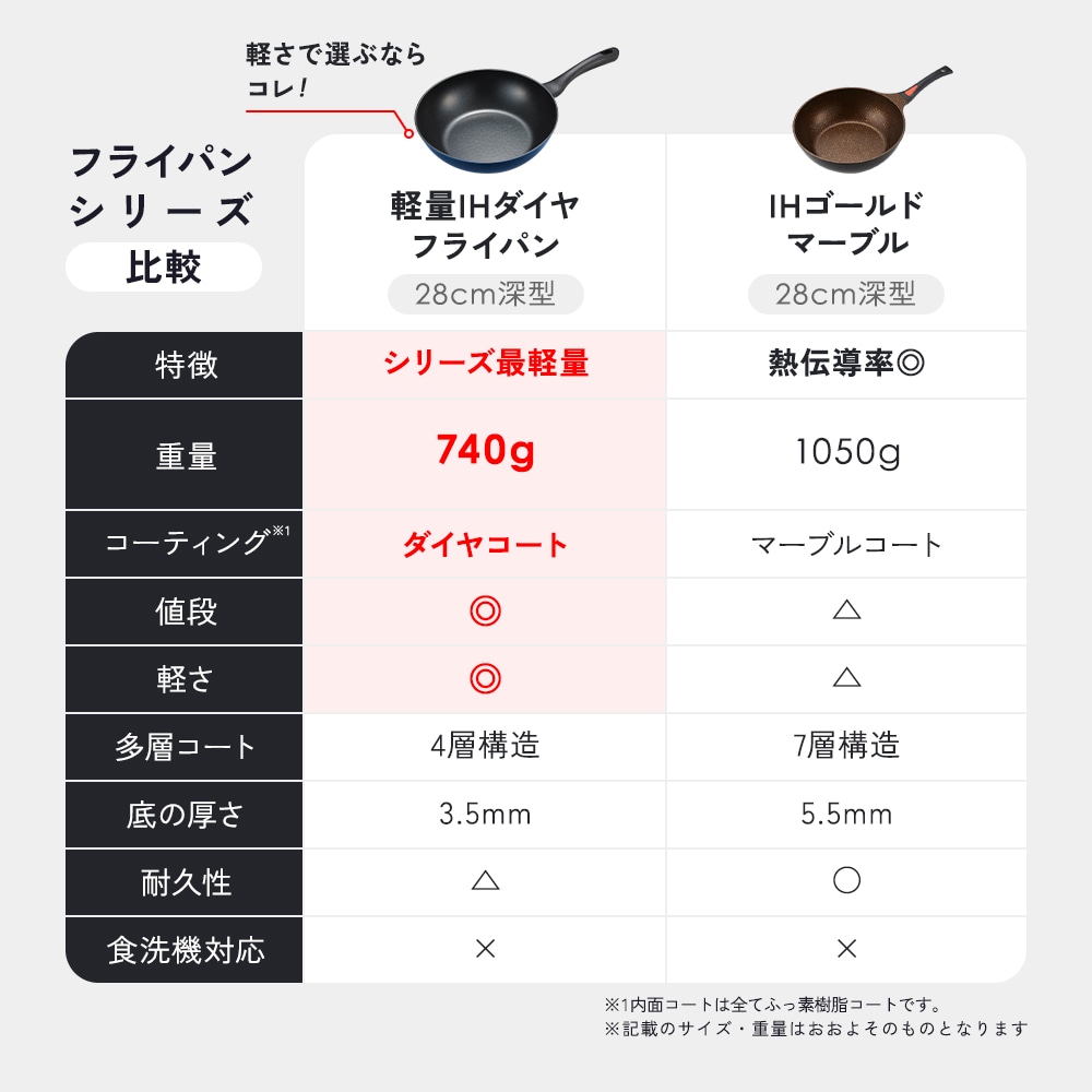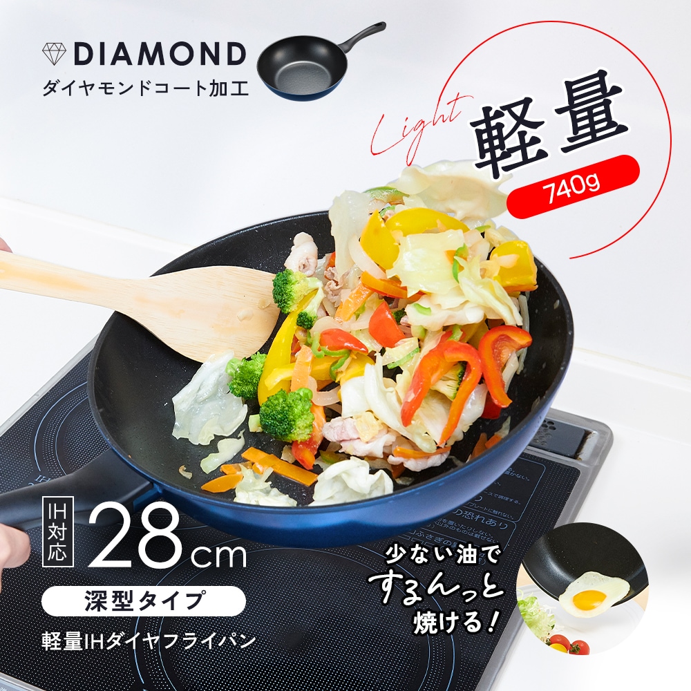 | 軽量(※1)なのに耐摩耗テスト50万回クリア(※2)!3.5mmの底厚で熱が均一に伝わりやすく、軽いIH対応ダイヤフライパン。多めの調理に便利な広めの深型28cmタイプ。人工ダイヤモンド配合ふっ素コートとアルミニウム合金の内面2層・外面2層の多層コートで焦げ付きにくく、少ない油でヘルシーに調理できます。