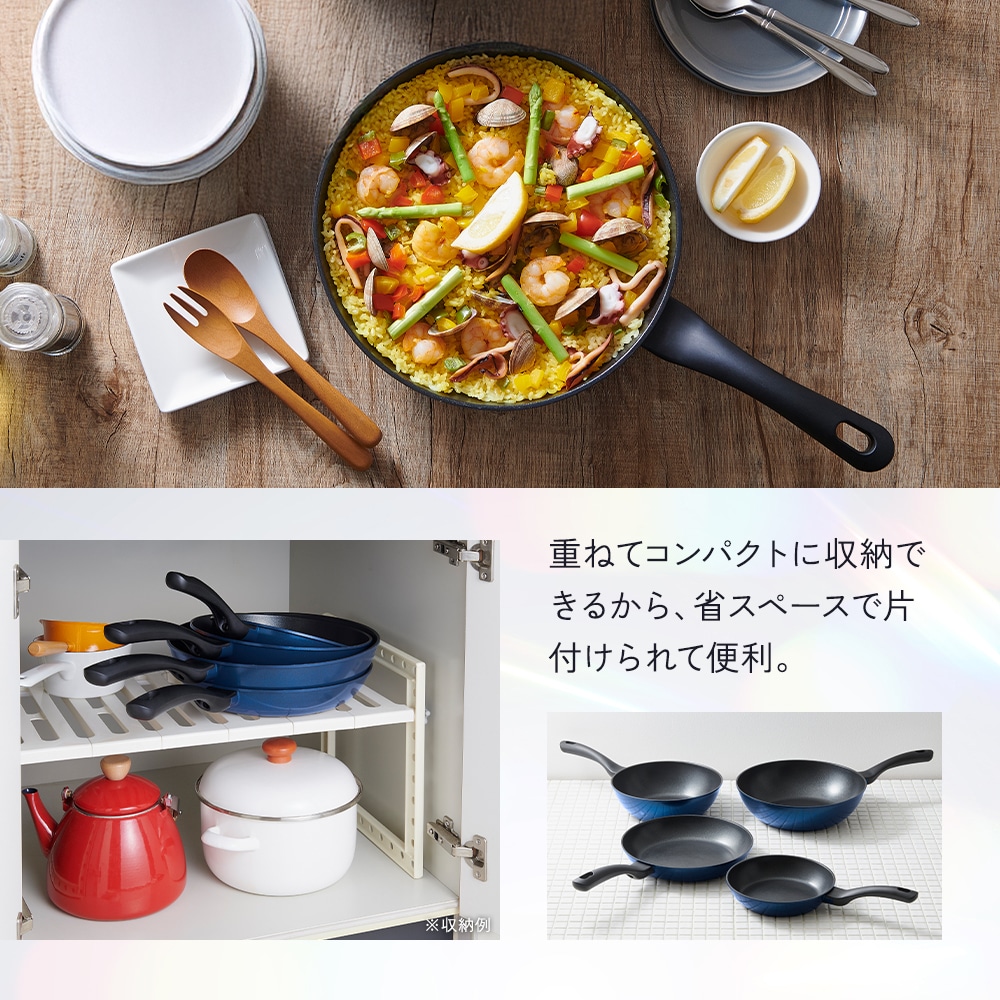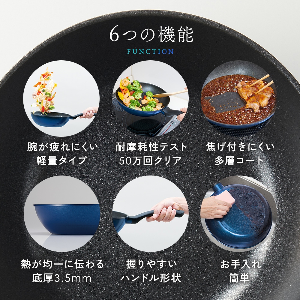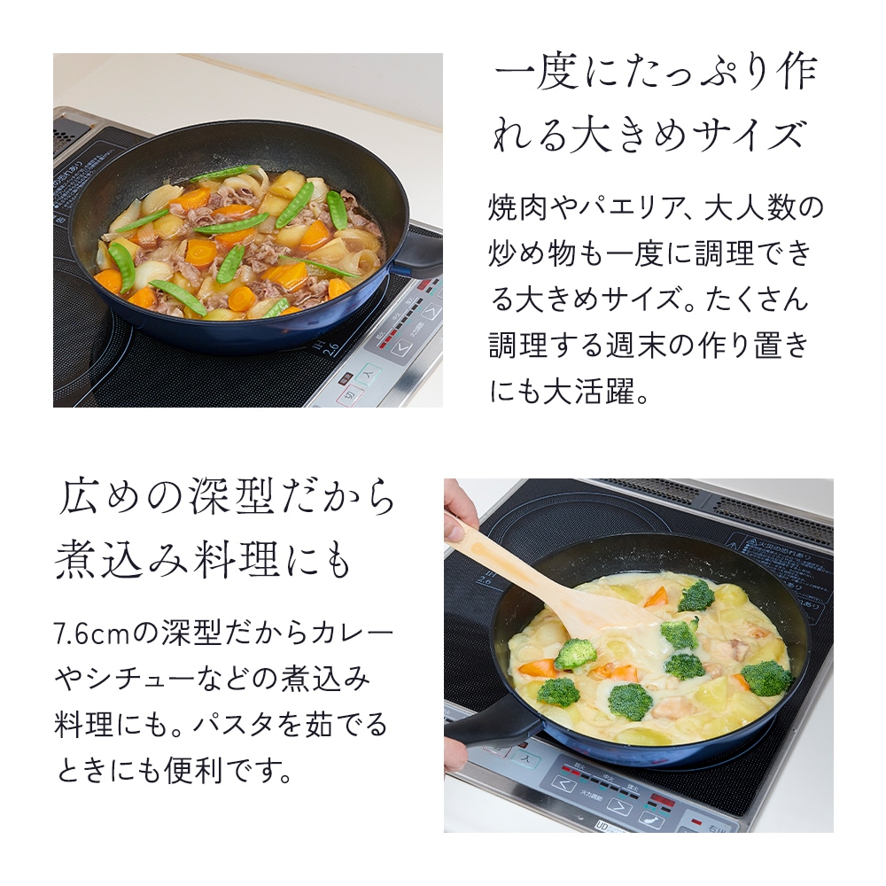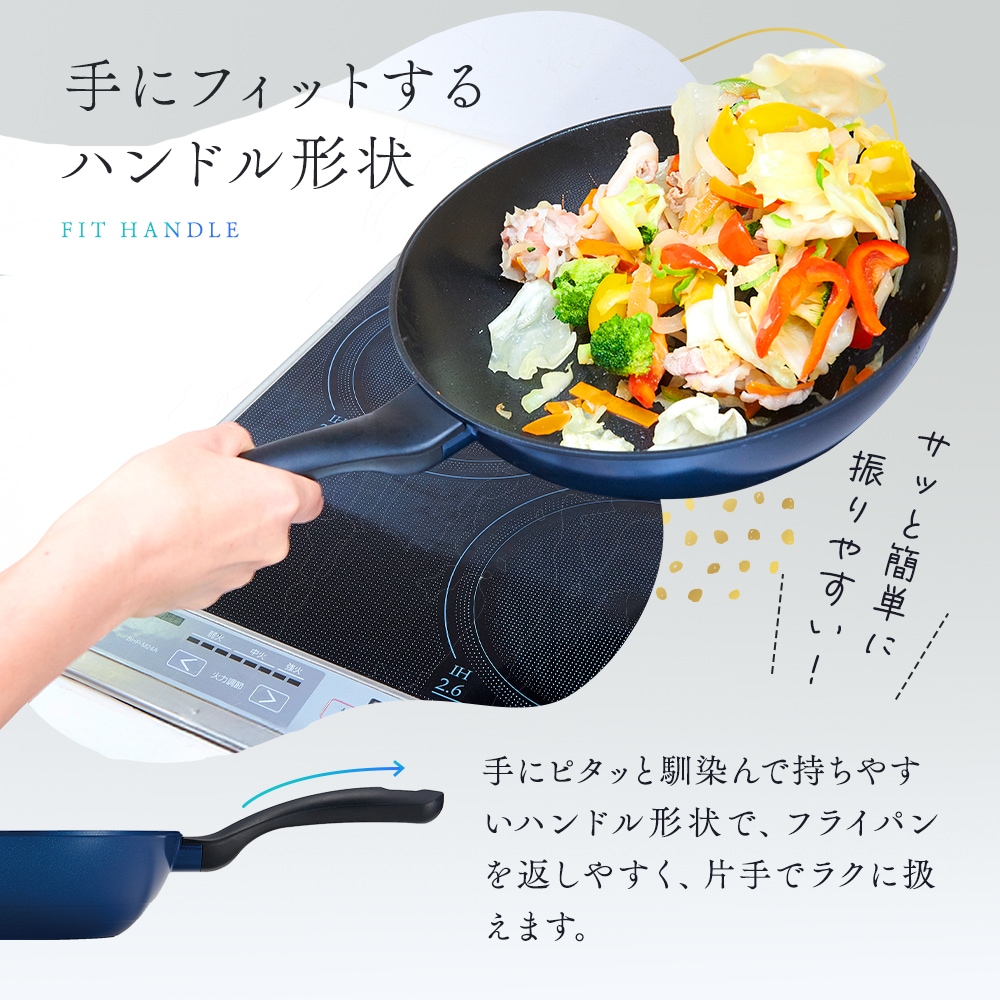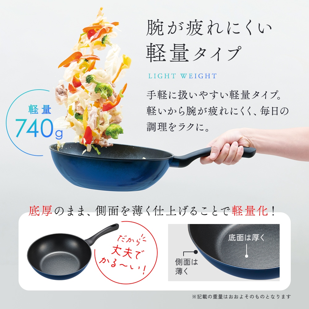 | 軽量(※1)なのに耐摩耗テスト50万回クリア(※2)!3.5mmの底厚で熱が均一に伝わりやすく、軽いIH対応ダイヤフライパン。多めの調理に便利な広めの深型28cmタイプ。人工ダイヤモンド配合ふっ素コートとアルミニウム合金の内面2層・外面2層の多層コートで焦げ付きにくく、少ない油でヘルシーに調理できます。