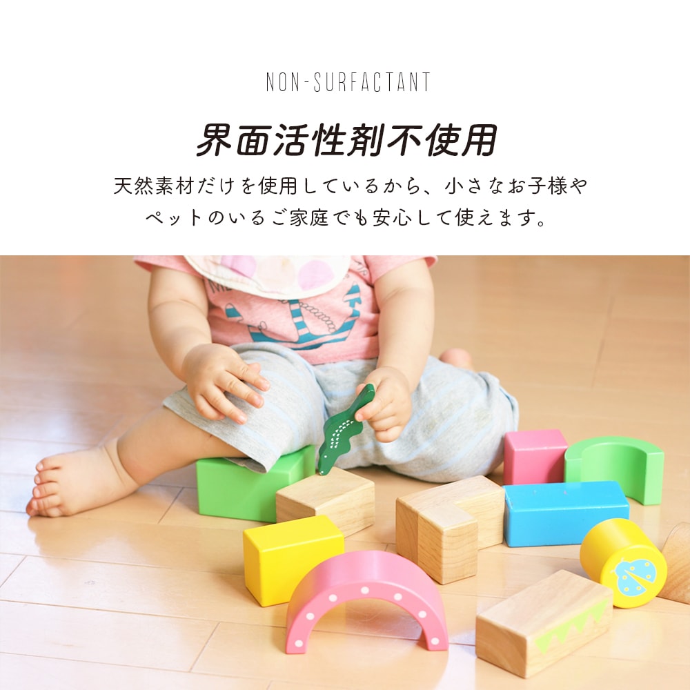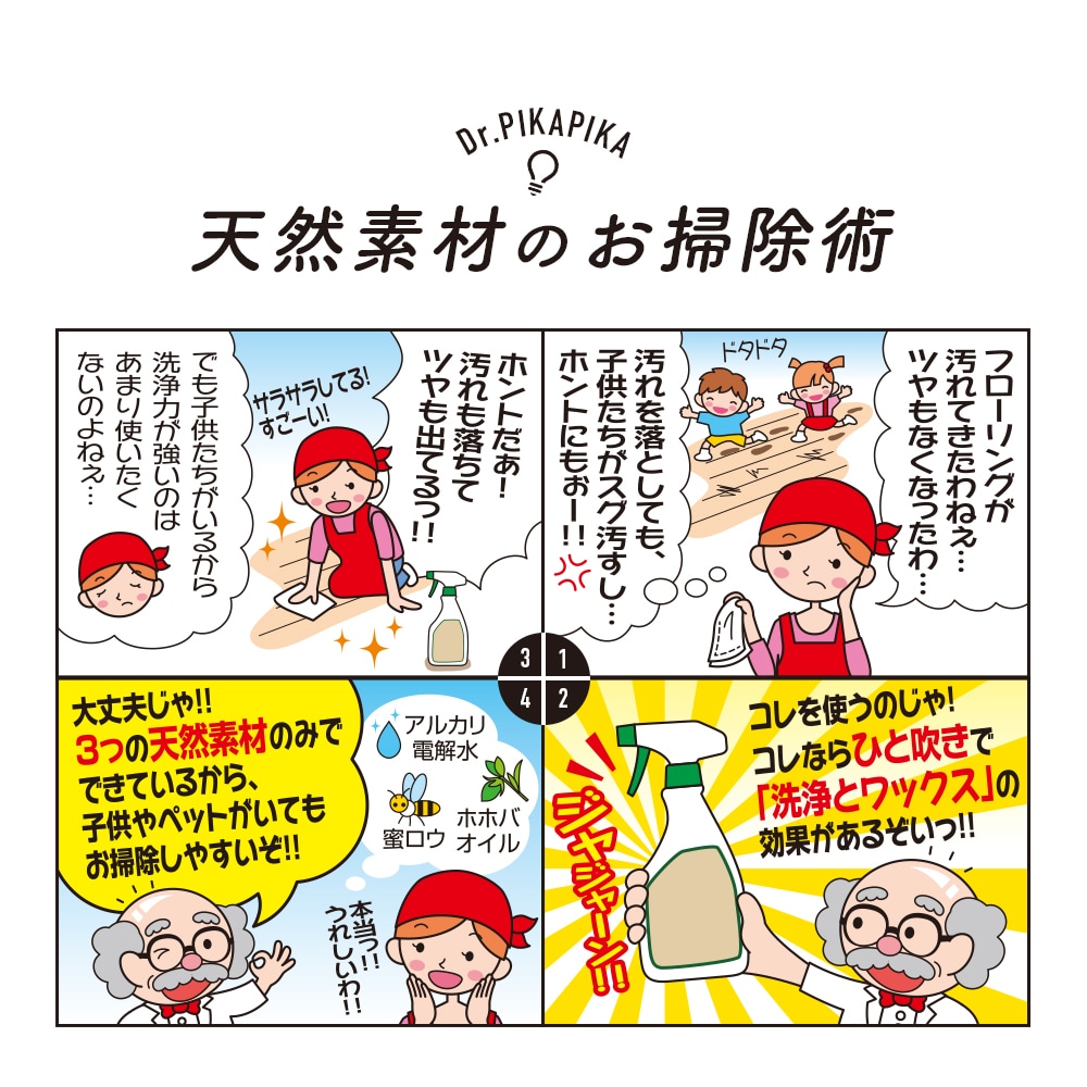 フローリング・木製家具に。天然素材の蜜ロウ・ホホバオイル・アルカリ電解水だけを使用したワックス効果のあるクリーナー。1本2役、汚れを落としながらワックス掛け!2度拭き不要。界面活性剤不使用。 1本で約55畳分。