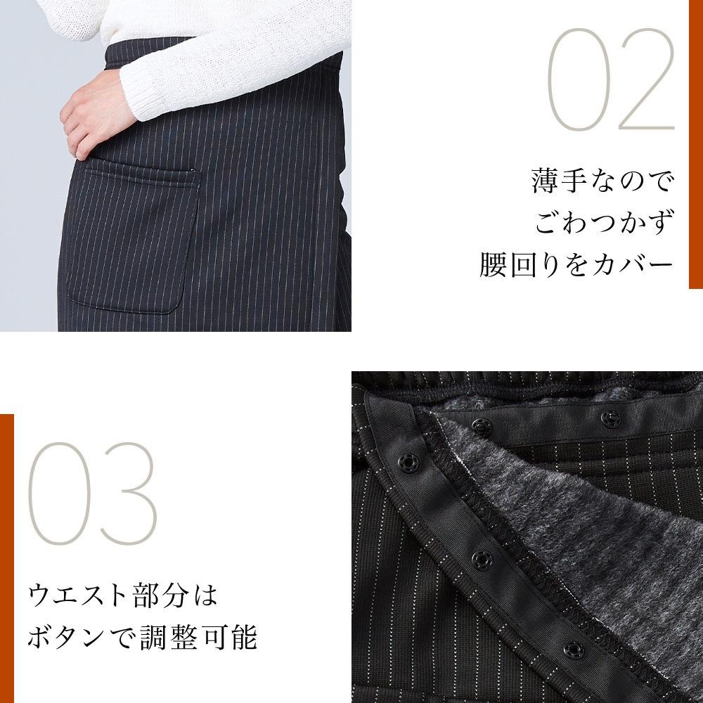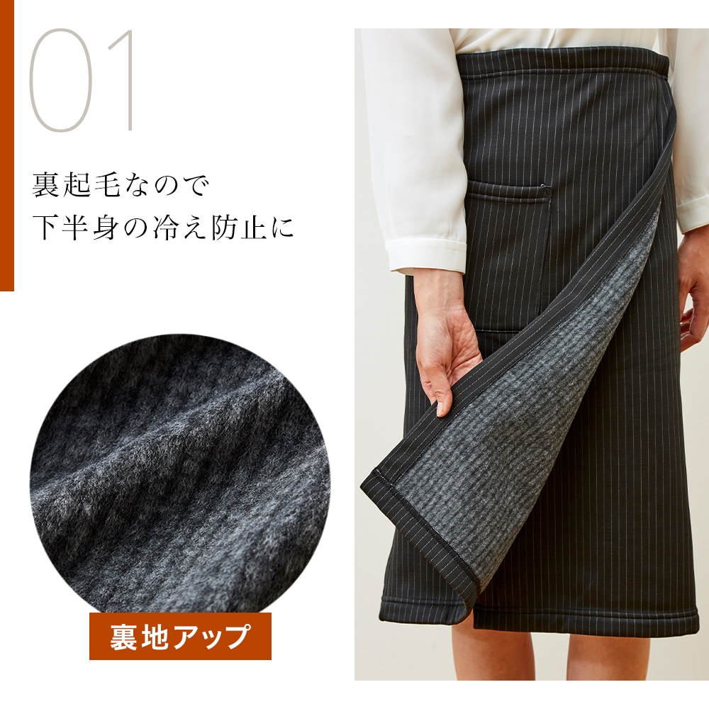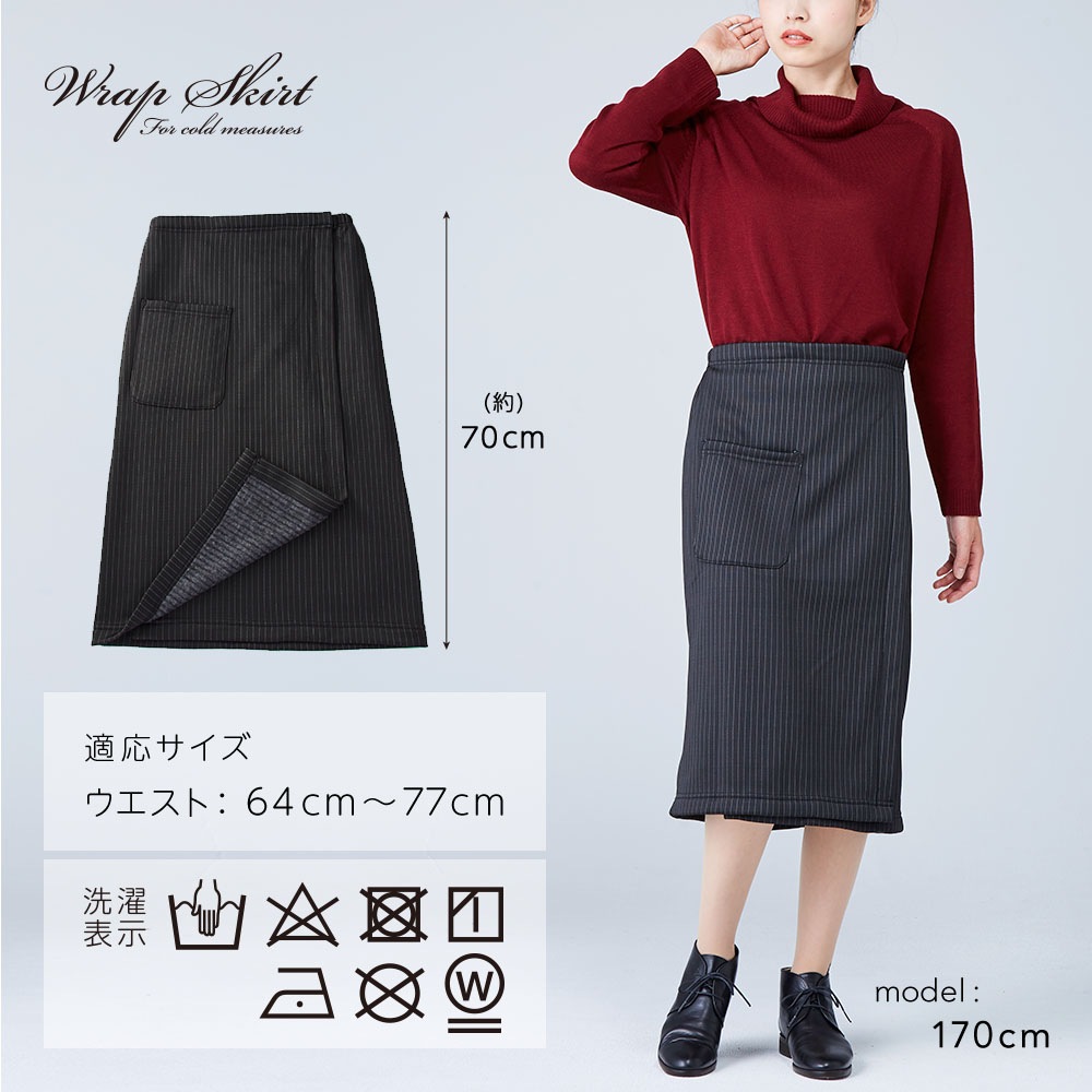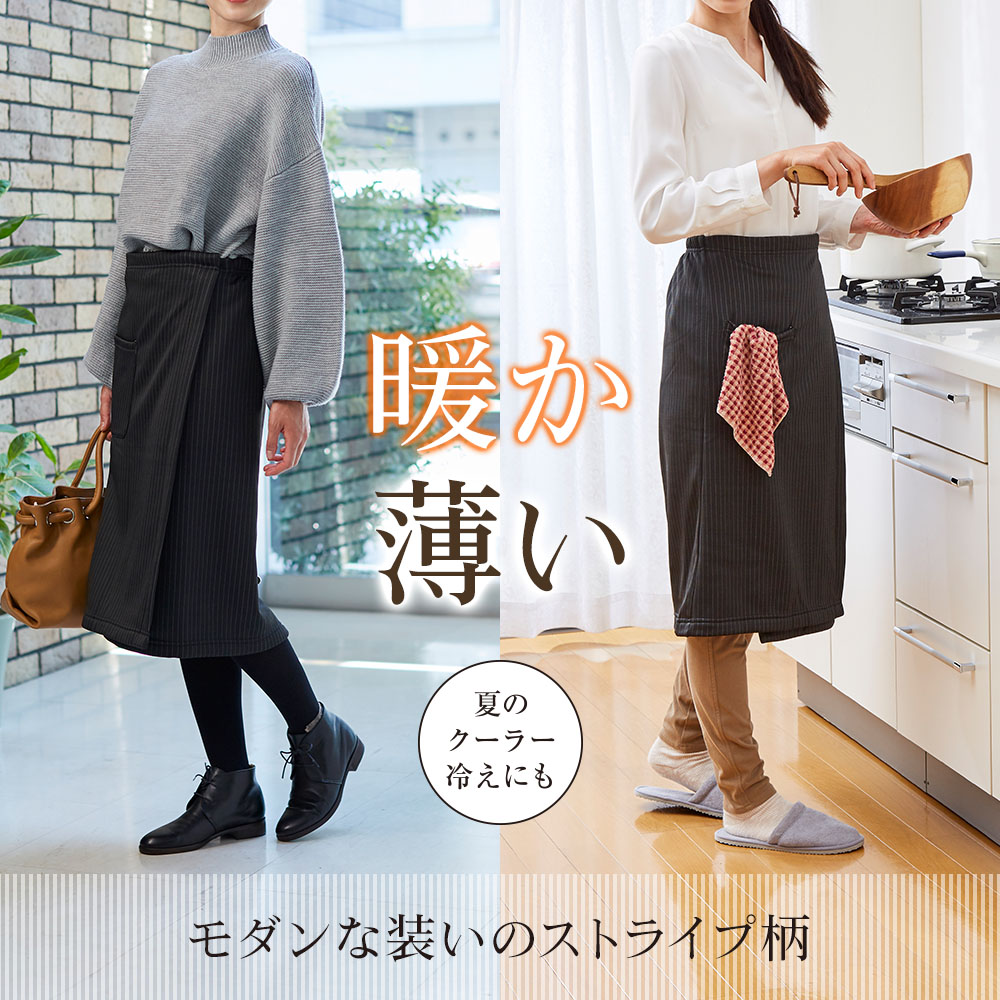 ストライプ柄でモダンな装いの巻きスカート。内側が裏起毛なので下半身が冷えた時の冷え防止に!夏のクーラー冷えの対策にも。薄手なのでモコモコせずに気になる腰回りもカバー。ウエストはスナップボタンと背面ゴムで自由に調節できます。スマホも入るポケット付で便利。