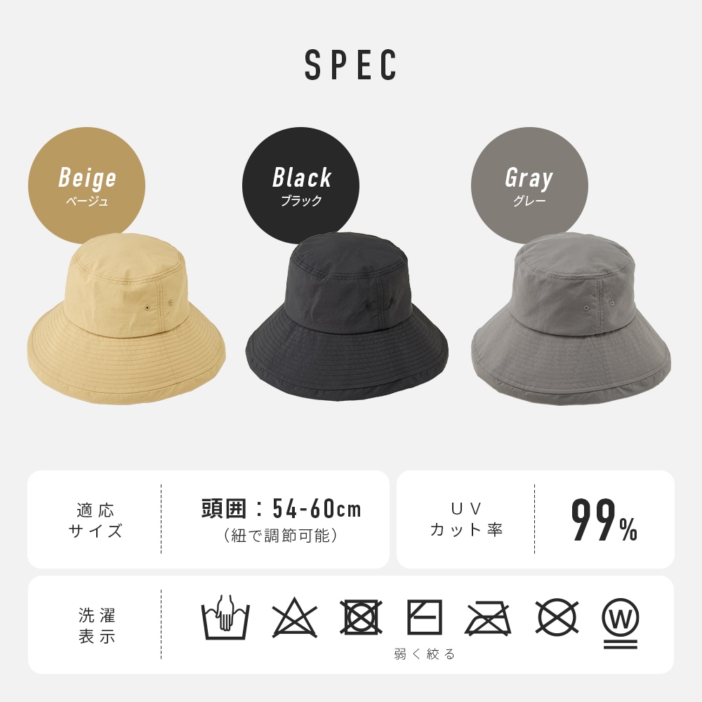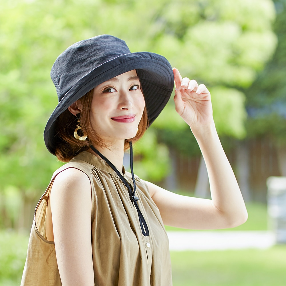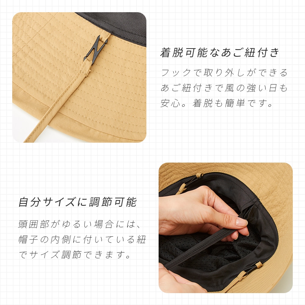 | 普段着からアウトドアまでいろんなコーデのUV対策に。コンパクトに折りたためるから持ち運びにも便利!つばの上げ下げで視界を調節できます。水をはじきやすい撥水加工。内側はムレにくいメッシュ生地を使用。フックで取り外し可能なあご紐付。頭囲部がゆるい場合はヒモで調節が可能です。手洗いOK。 |