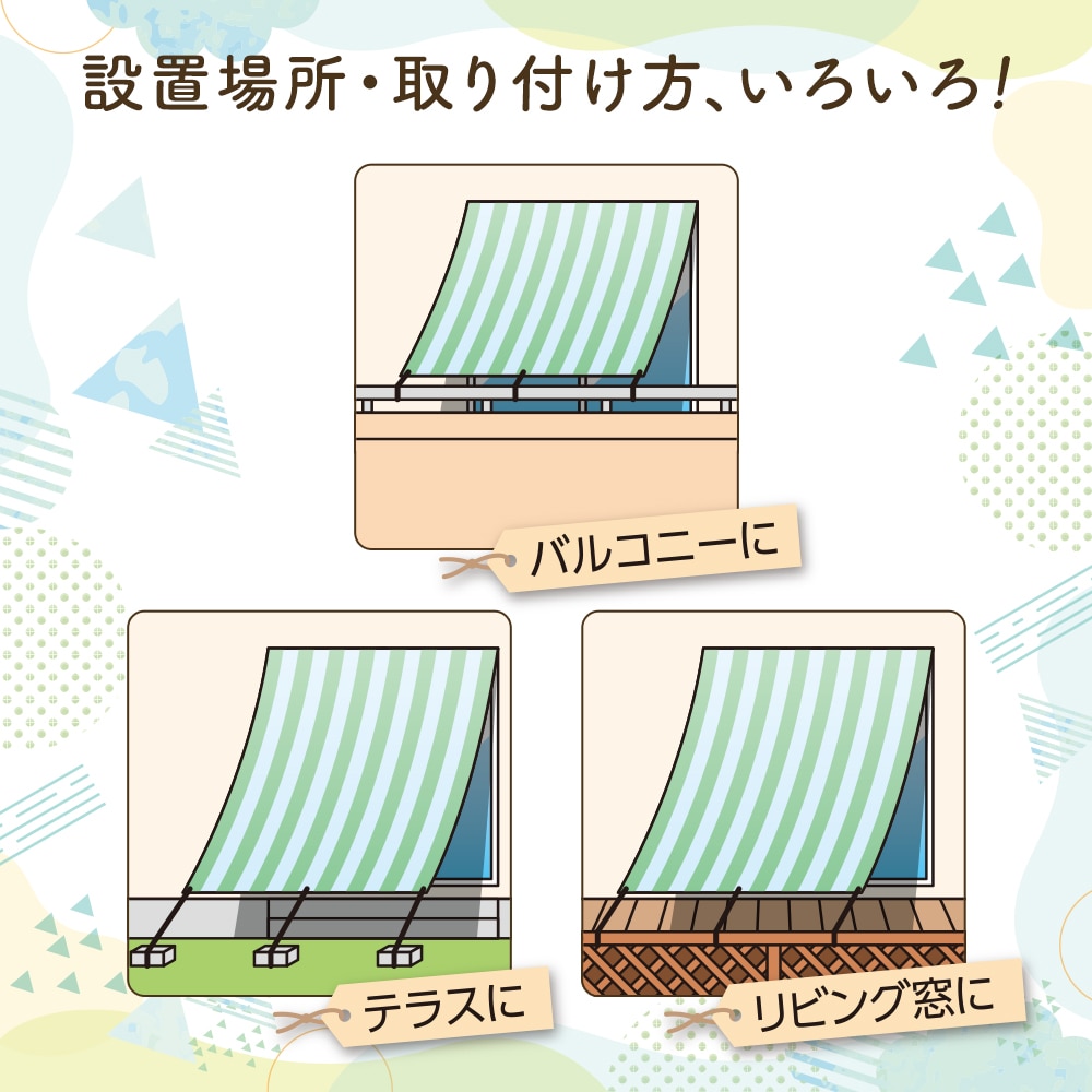 | 日差しを遮り、風を通す!通風性のある生地で、風を通しながら強い日差しや気になる視線をカット。日よけ・遮熱できるサンシェードで涼しく快適に。西日対策としても使えます。紐で固定するので設置場所も取り付け方もいろいろ!バルコニーやリビング窓、テラスなどに。 |