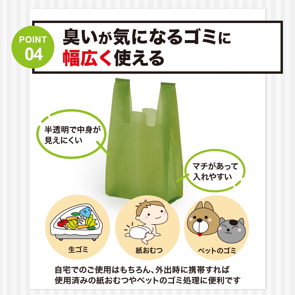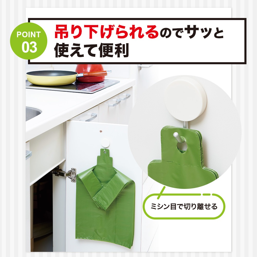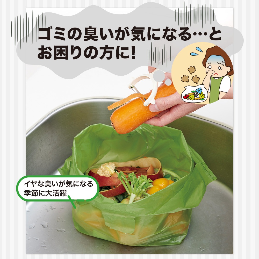 | 消臭剤配合でニオイ成分を吸収。厚み25ミクロンの袋で臭いを外に逃がしにくい。吊り下げられるのでサッと使えて便利。キッチンの生ゴミやペットのお世話、紙おむつの処理などに。 |