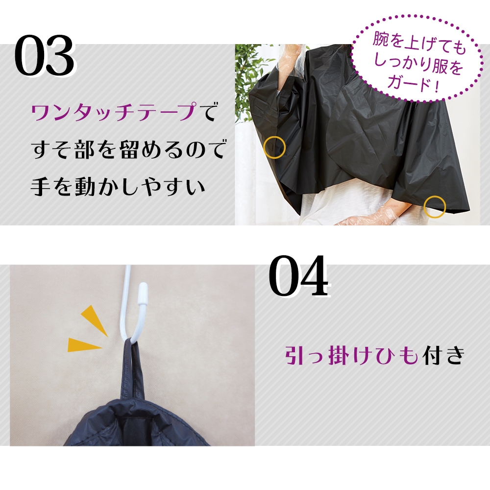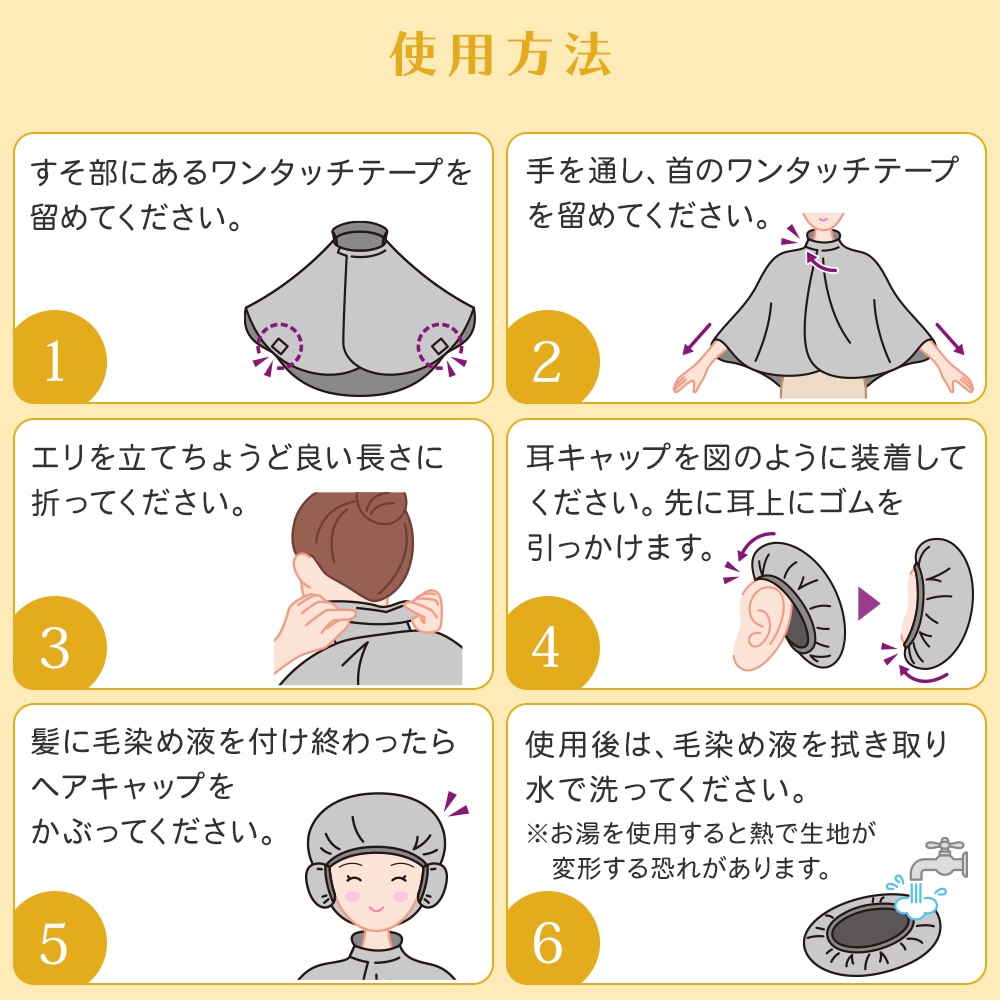 | 家庭での毛染めに便利なケープ・ヘアキャップ・耳キャップの3点セット。肩から背中まで液ハネを防止!エリ付だから首もとを液だれの汚れからガードします。ワンタッチテープで着脱も簡単!衣類の汚れ防止に。 |
