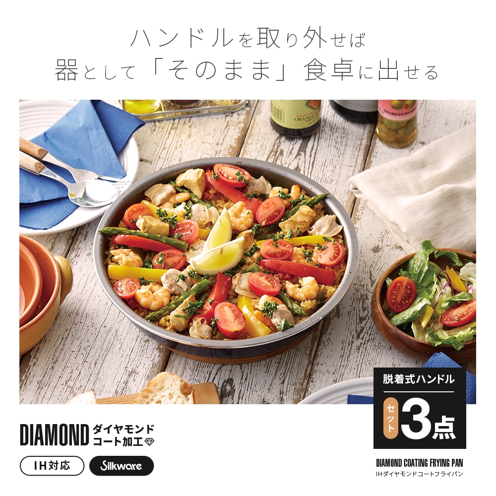 フライパンセット フライパン 24cm 20cm IH 取っ手が取れる ダイヤモンドコート 3点セット 深型 焦げ付かない 軽量 ダイヤモンド加工 調理用品 調理器具 ダイヤコート ダイヤモンドコート フライパン IH 調理 料理 焦げ付きにくい お手入れ 簡単 楽々 取っ手 取手 取れる 外せる ビビンバ ビビンパ パエリア