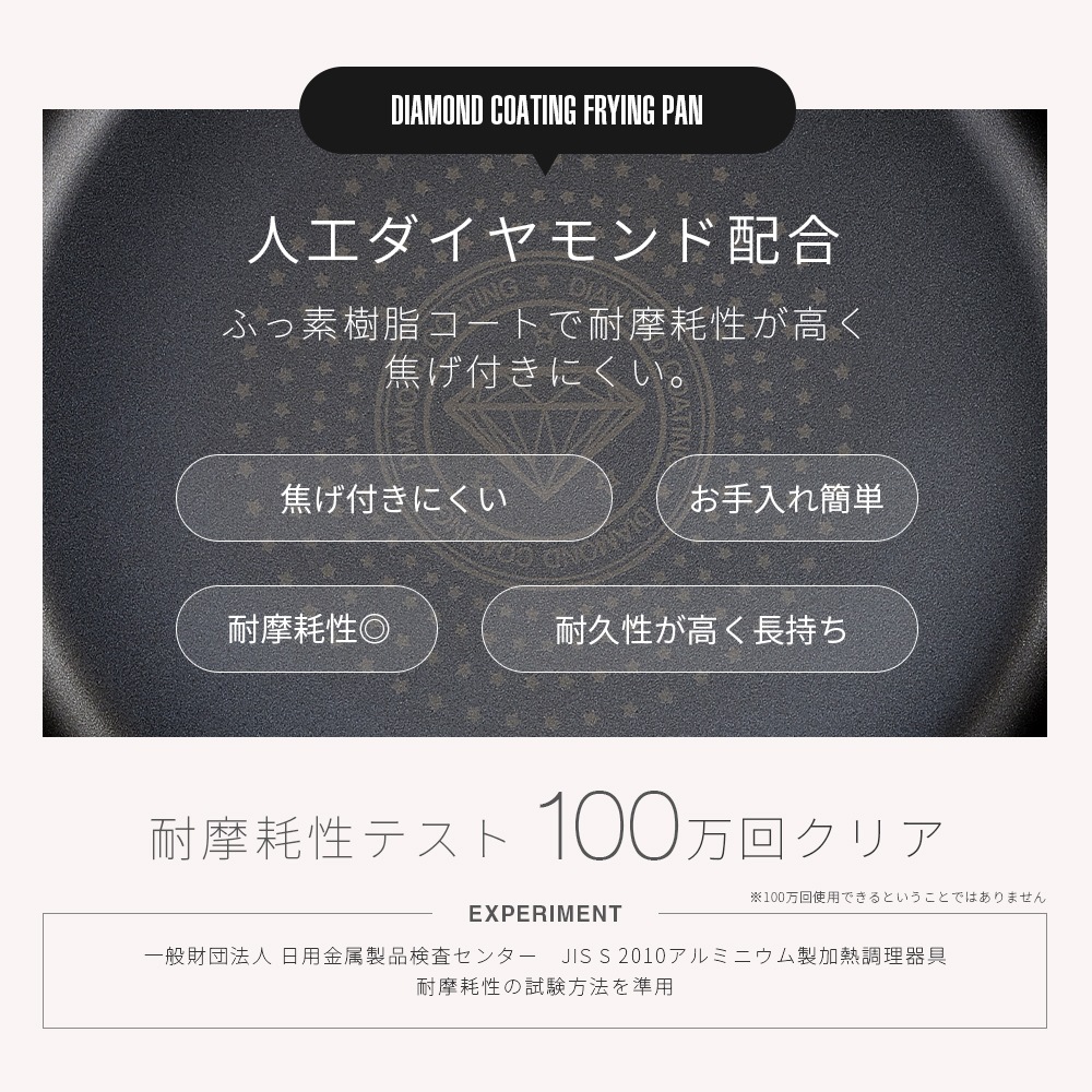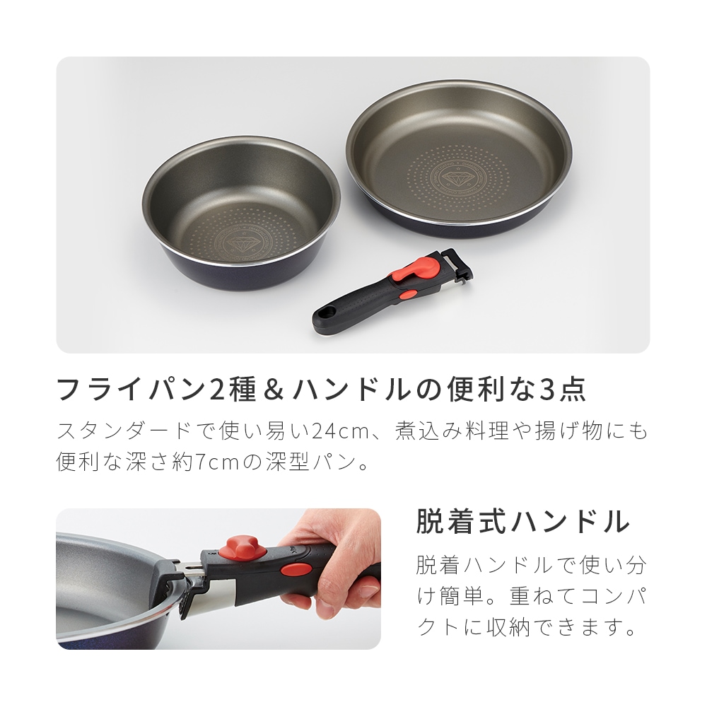 | 取り外し可能な脱着式ハンドルと、24cm・20cm深型フライパンの便利な3点セット。微細粒子の人工ダイヤモンドをふっ素樹脂に配合した磨耗に強いコーティング。内面3層・外面2層の多層コートで耐磨耗性が高く、焦げ付きにくいのでお手入れも楽々です。深型パンを使えば、揚げ物や煮込み料理も簡単。ハンドルを取り外せば、そのまま食卓にも出せるので、ビビンバやパエリアにも。 |