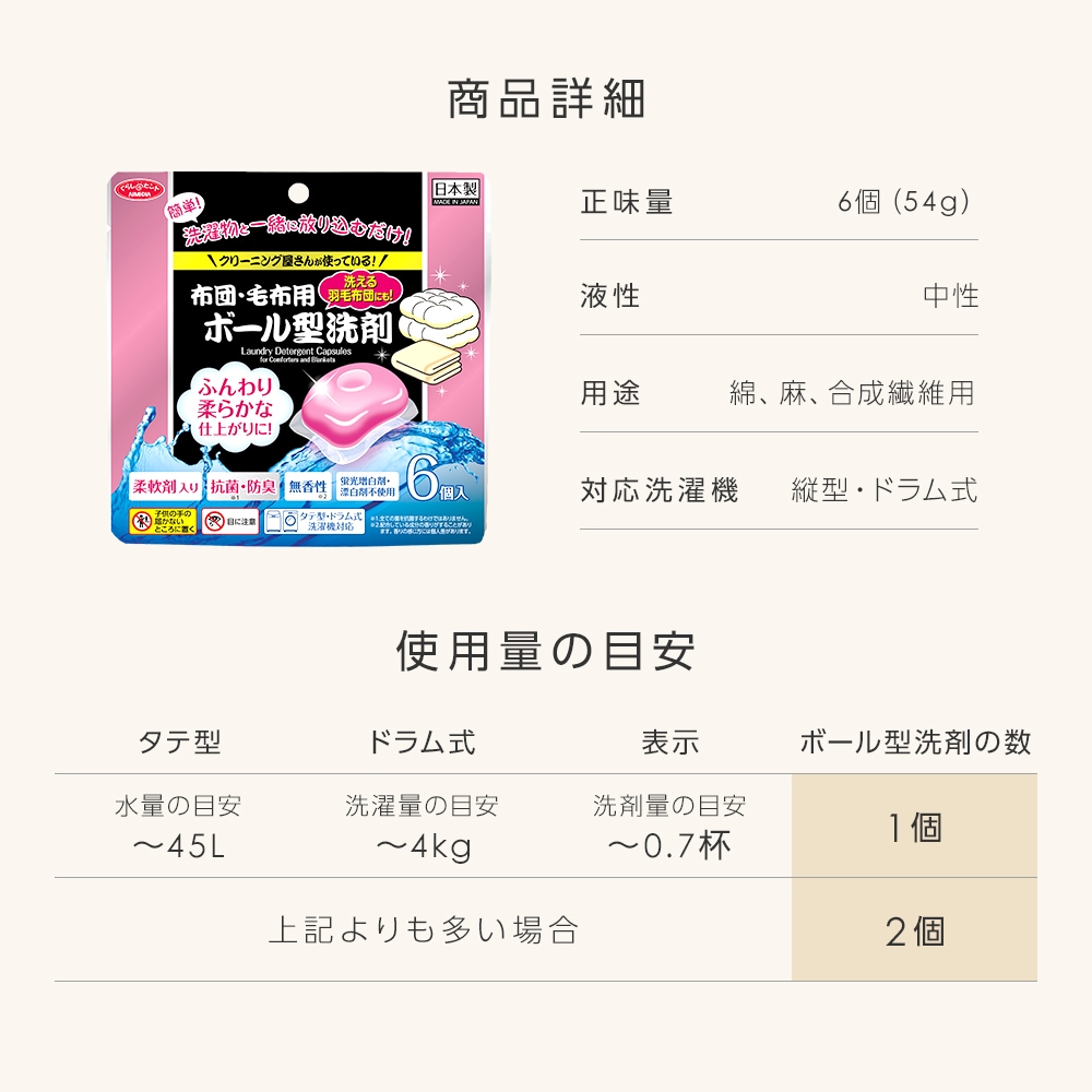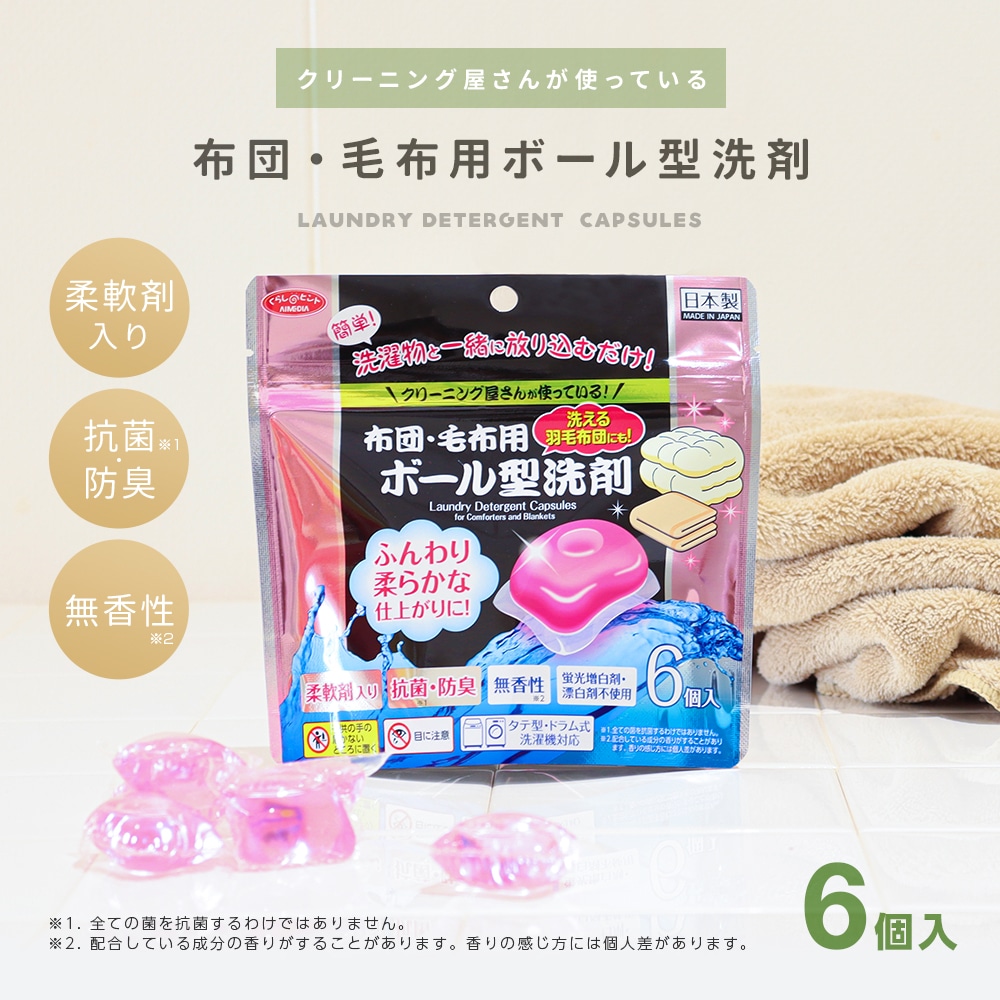 液体洗剤 ボール型 羽毛布団 布団用 毛布用 洗剤 6個入 業務用 柔軟剤入り 日本製 無香料 抗菌 防臭 クリーニング ウォッシャブル羽毛布団 洗える羽毛布団 ふとん 布団 毛布 蛍光増白剤不使用 漂白剤不使用 タテ型洗濯機対応 ドラム式洗濯機対応 ふんわり仕上げ 柔らか やわらか ふわふわ ふかふか