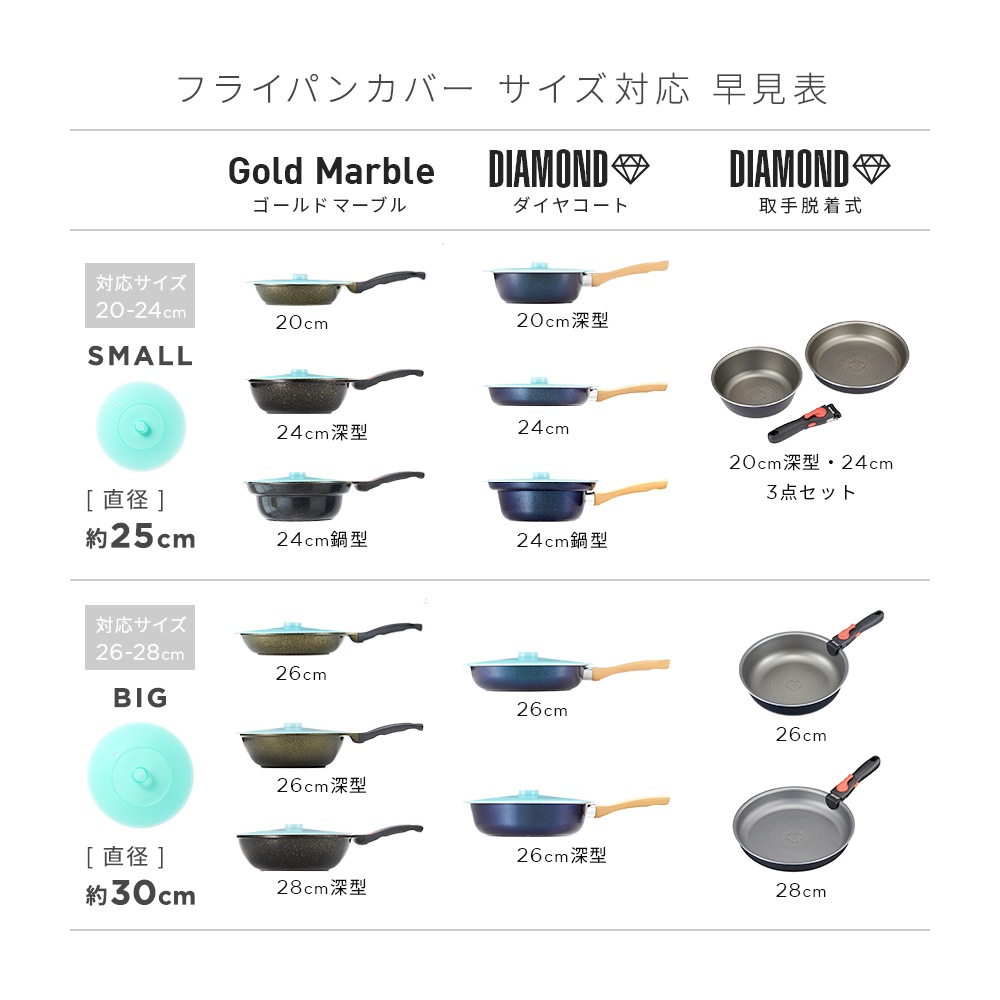 小/20〜24cmフライパン・鍋、大/26〜28cmフライパン・鍋 |