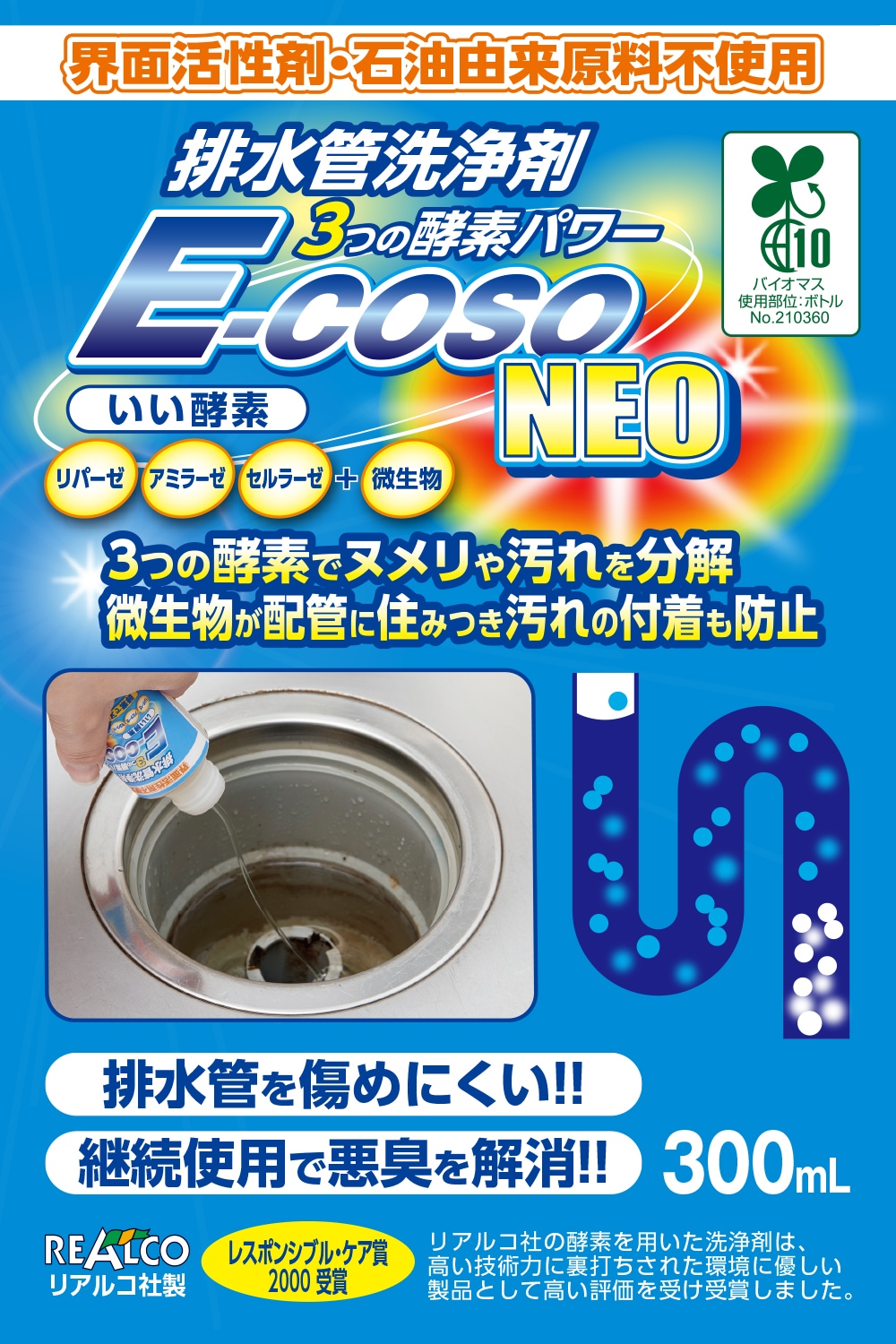 配管用洗剤 排水管洗浄剤 パイプクリーナー 300ml 排水口 排水溝 排水管 酵素 微生物 つまり ヌメリ 臭い 掃除 キッチン 洗面台 パイプ洗浄剤 浴室 配管 排水管クリーナー パイプ 洗面所 台所 お風呂 詰まり ぬめり 悪臭 解消 バイオマス