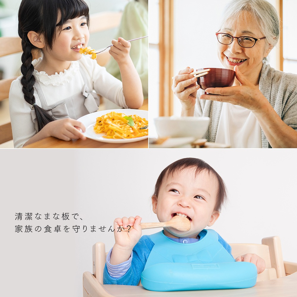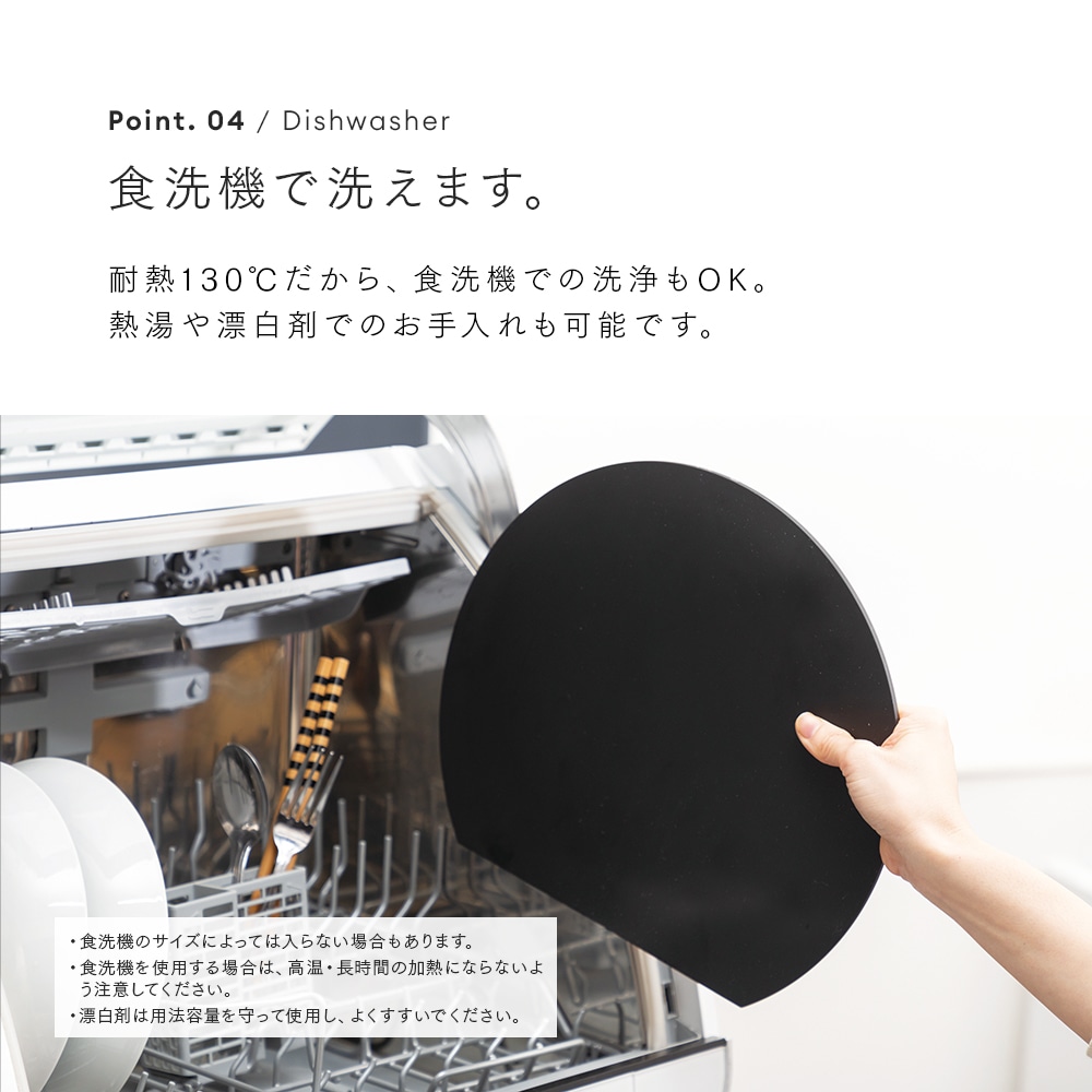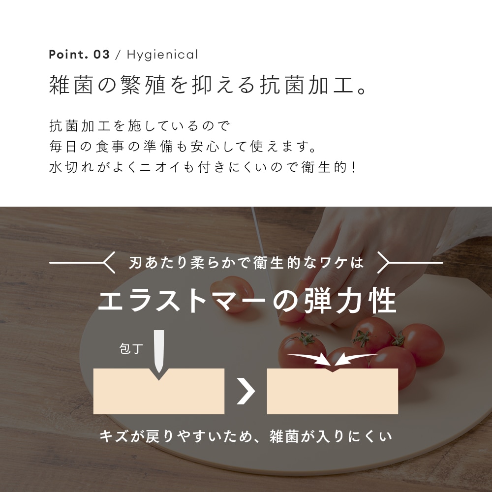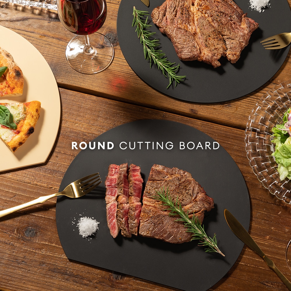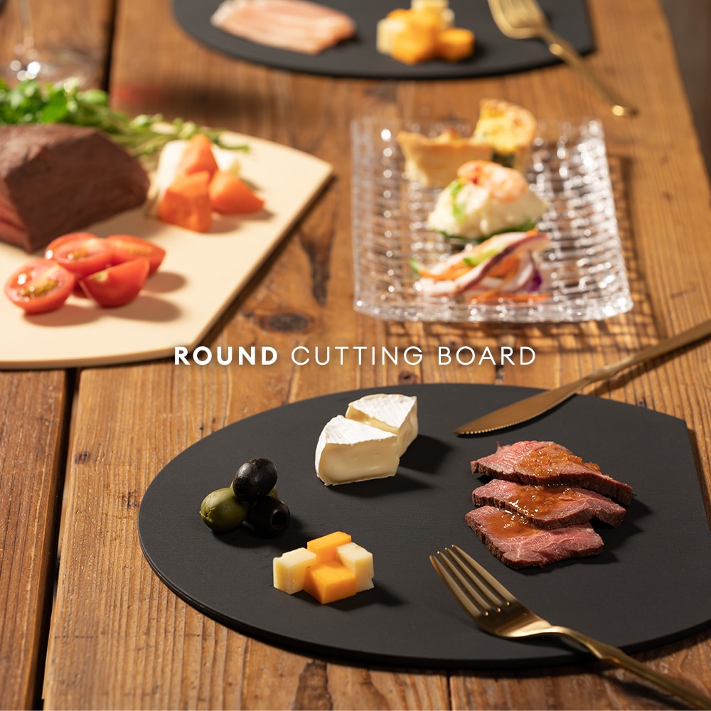 | 刃あたりが柔らかく食材がすべりにくい、弾力性のある耐熱エラストマーまな板。面積が広い丸形だから、カットした食材を並べて置いてお皿いらず!食洗機使用OK。耐熱130℃ |
