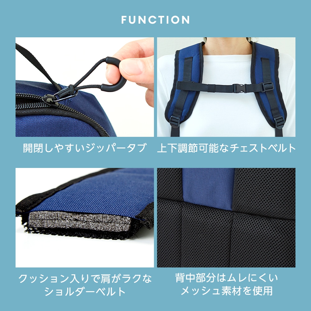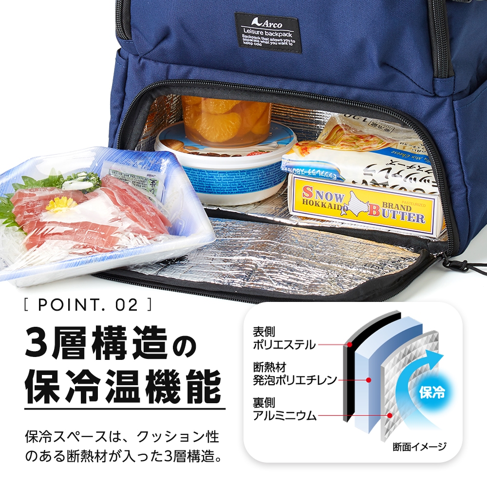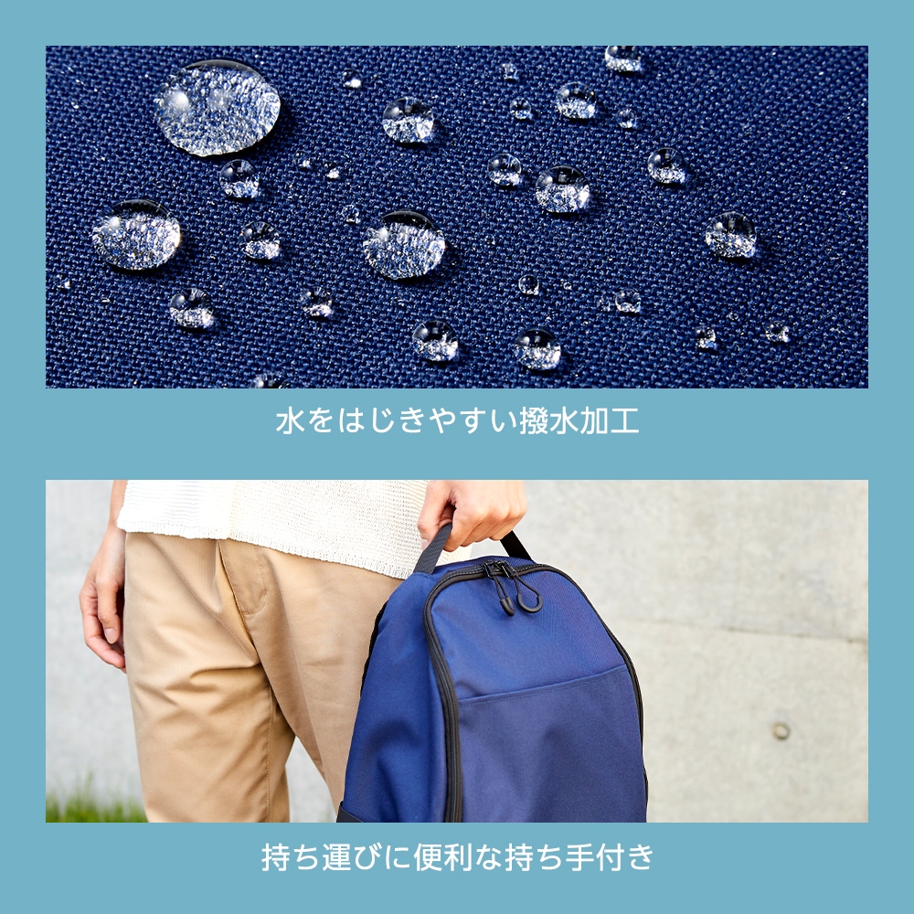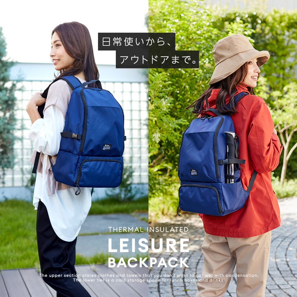 | 保冷温したいものを分けて収納できる2気室リュック。大きく開いて出し入れしやすい上段スペースには、結露で濡らしたくない着替えやタオルなどを収納。断熱材入りの3層構造の保冷機能が付いた下段は、お弁当やドリンクなどの保冷温スペースに。ショルダーベルトはクッション入りで肩の負担を軽減。背中はムレにくいメッシュ素材。水をはじきやすいはっ水加工。 |