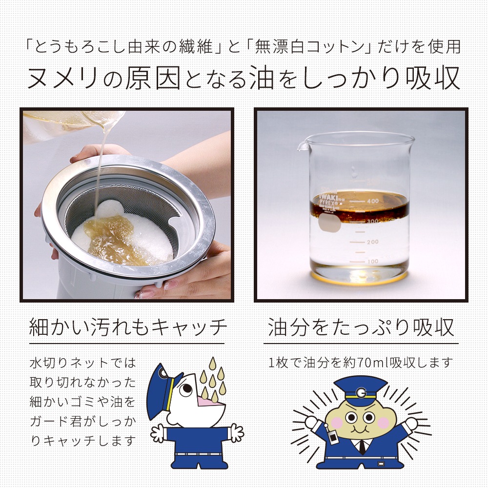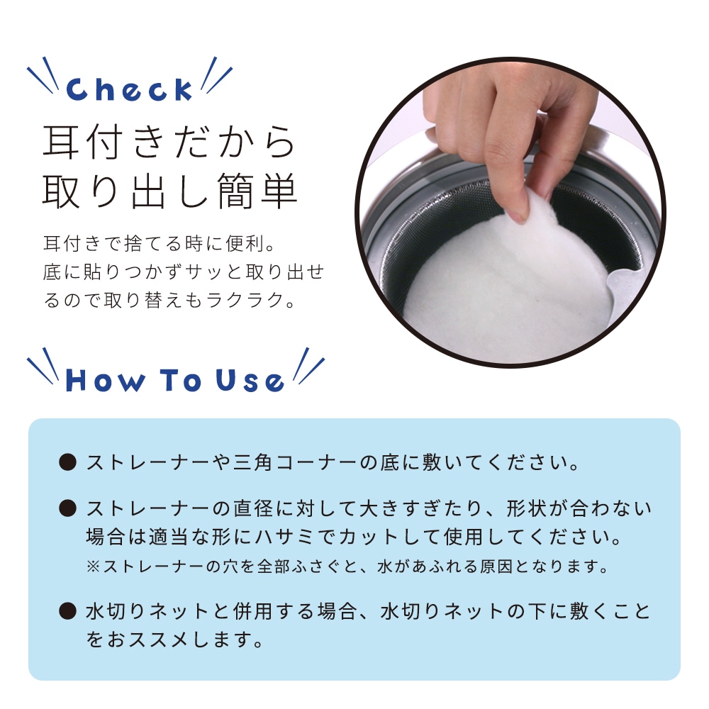 | ストレーナーや三角コーナーの底に敷いて、今まで取りきれなかった油やゴミをしっかりキャッチ!水は通して、ヌメリの原因となる油を吸収します。1枚でたっぷり最大70mlの油を吸い取ります。キレイな排水で排水管もヌメリにくい!とうもろこし由来繊維と無漂白コットンだけを使用しました。耳付きで取り出しやすい形状です。 |