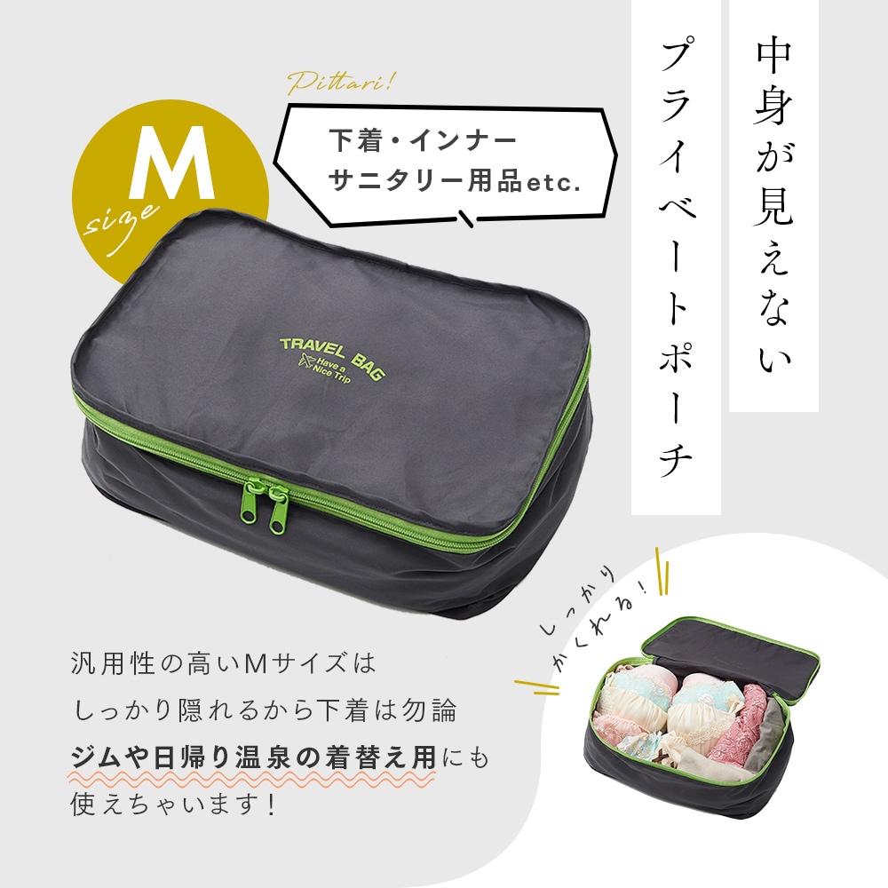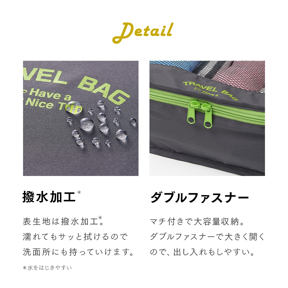 | 衣類の種類やサイズに合わせて使い分け!仕分けも配置もわかりやすいL・M・Sの3種セット。小型・中型のキャリーケースにおすすめ。ダブルファスナーで大きく開くので出し入れしやすく、はっ水加工の表生地で水をはじきやすい設計です。LとSは片面がメッシュ生地で通気性があり、中身が一目でわかりやすい仕様です。Mサイズは中身が見えない仕様なのでプライベートなモノの収納に。 ・L…シャツ・セーター・Tシャツ・ボトムなどに ・M…下着・インナーなどに ・S…靴下・ハンカチ・細々とした小物に |