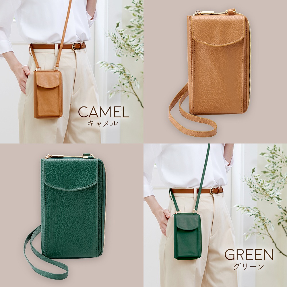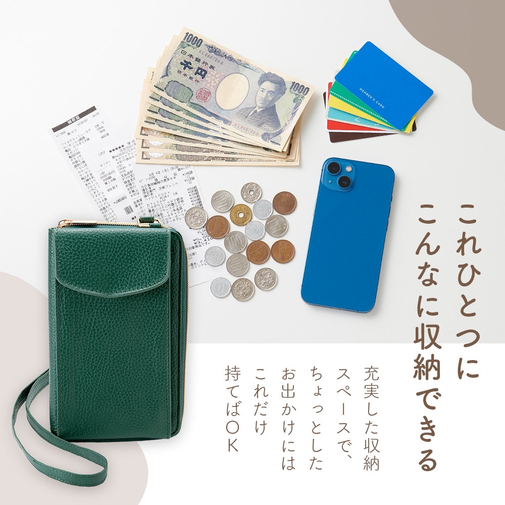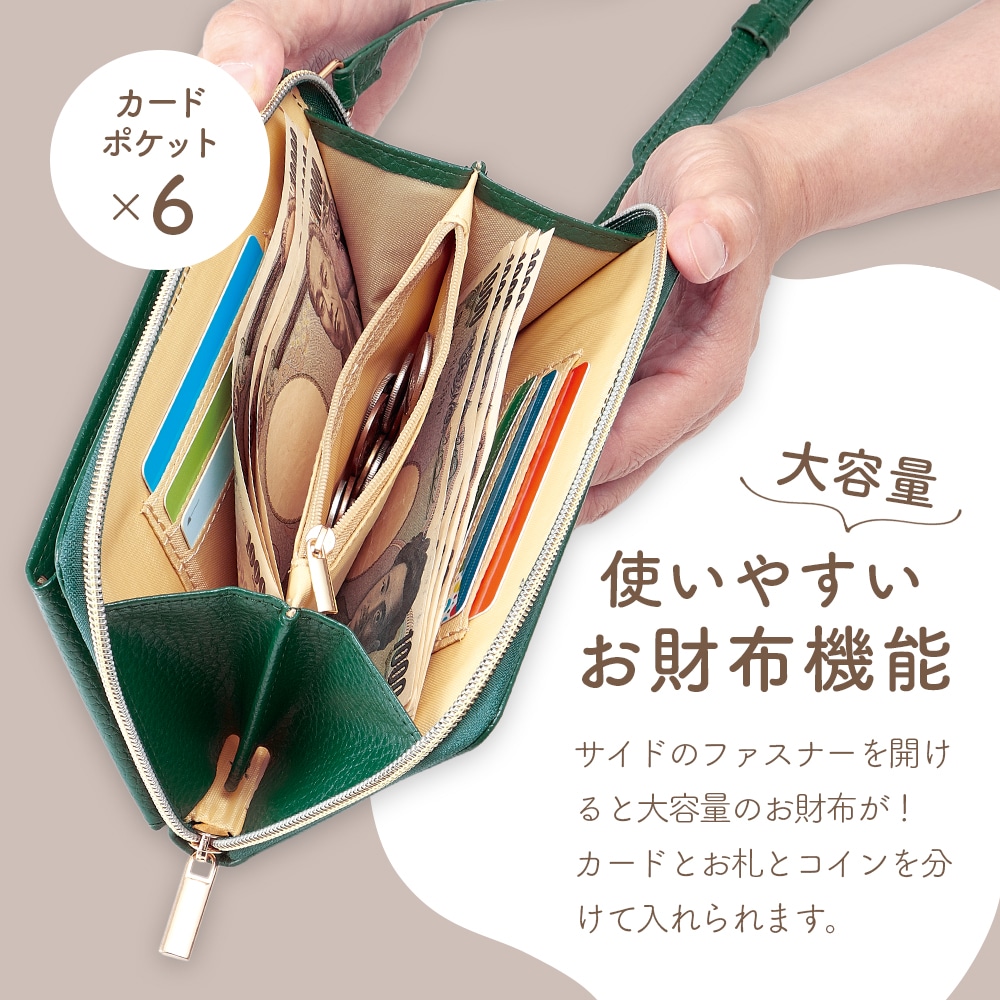 | ちょっとしたお出掛けにはこれだけ持てばOK!お財布とスマホケースがこれ一つ。大きいサイズのスマホでも出し入れラクラク!肩掛け、斜め掛けで手ぶらで歩ける。スマートフォン×1、カードポケット×6、お札入れ×2、コイン入れ×1。 |