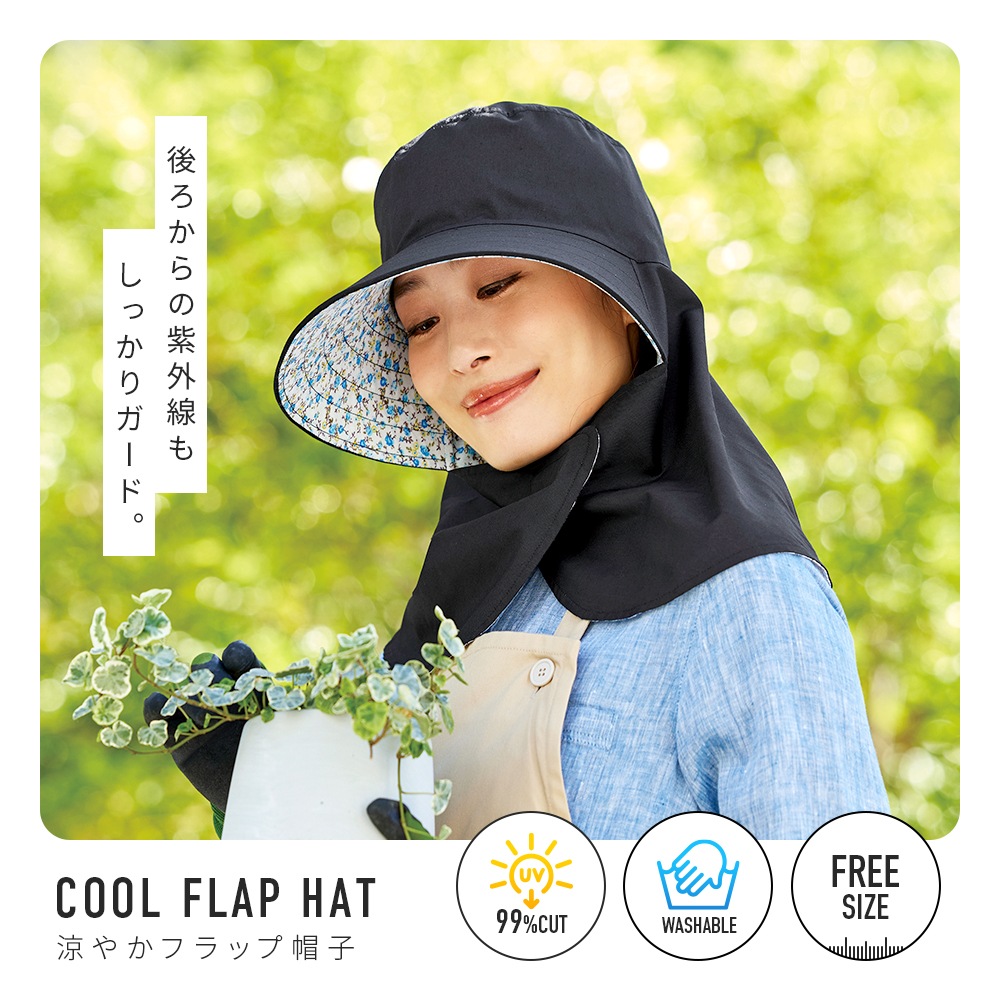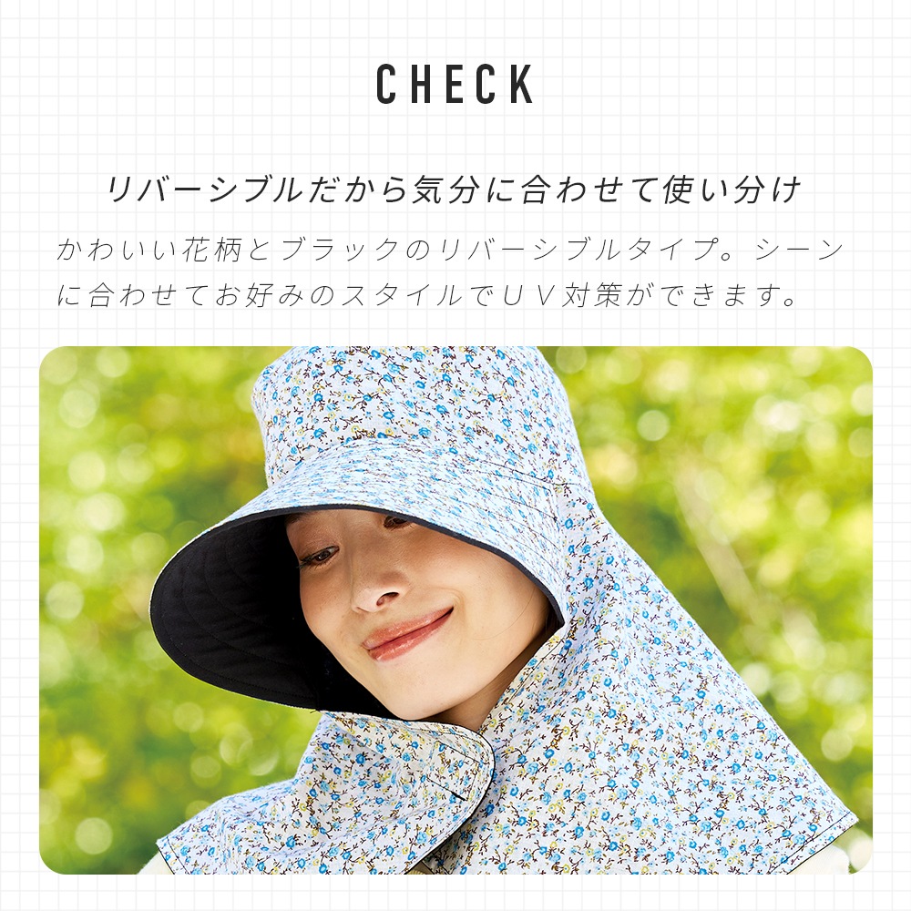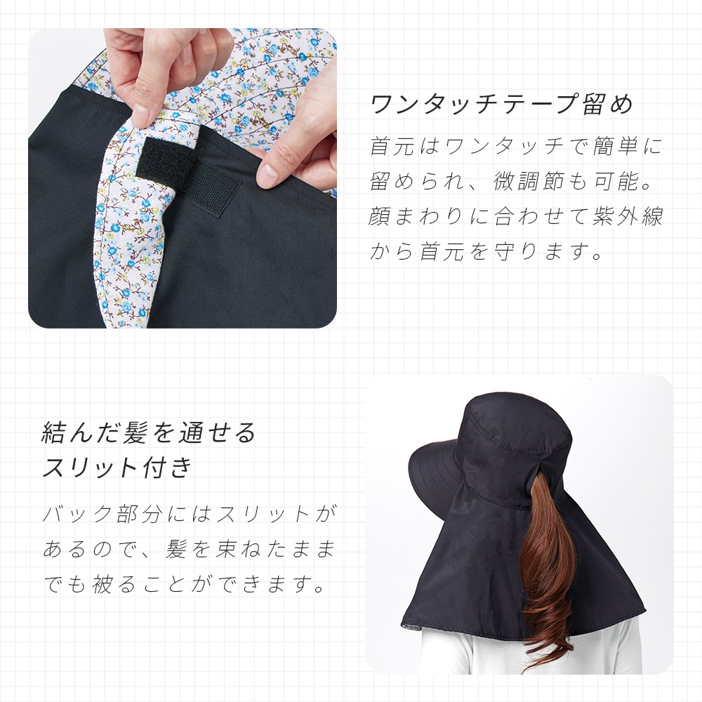 | 広めのツバで前からの日差しはもちろん、フラップ部が首もと・首すじの日差しもしっかりガード!ガーデニングやスポーツ観戦、アウトドアシーンに。首もとはワンタッチテープで簡単に留められます。片側はブラック、もう片側はおしゃれな花柄のリバーシブルタイプのデザイン。後頭部には結んだ髪を通せるスリット付。UVカット率99%以上。手洗いOK。 |