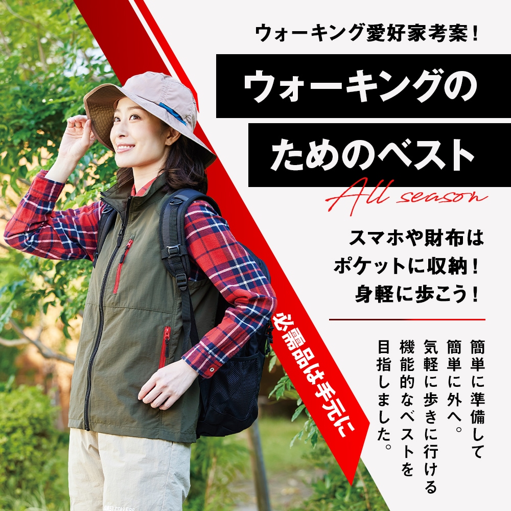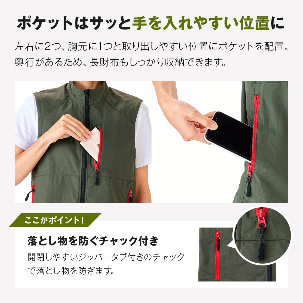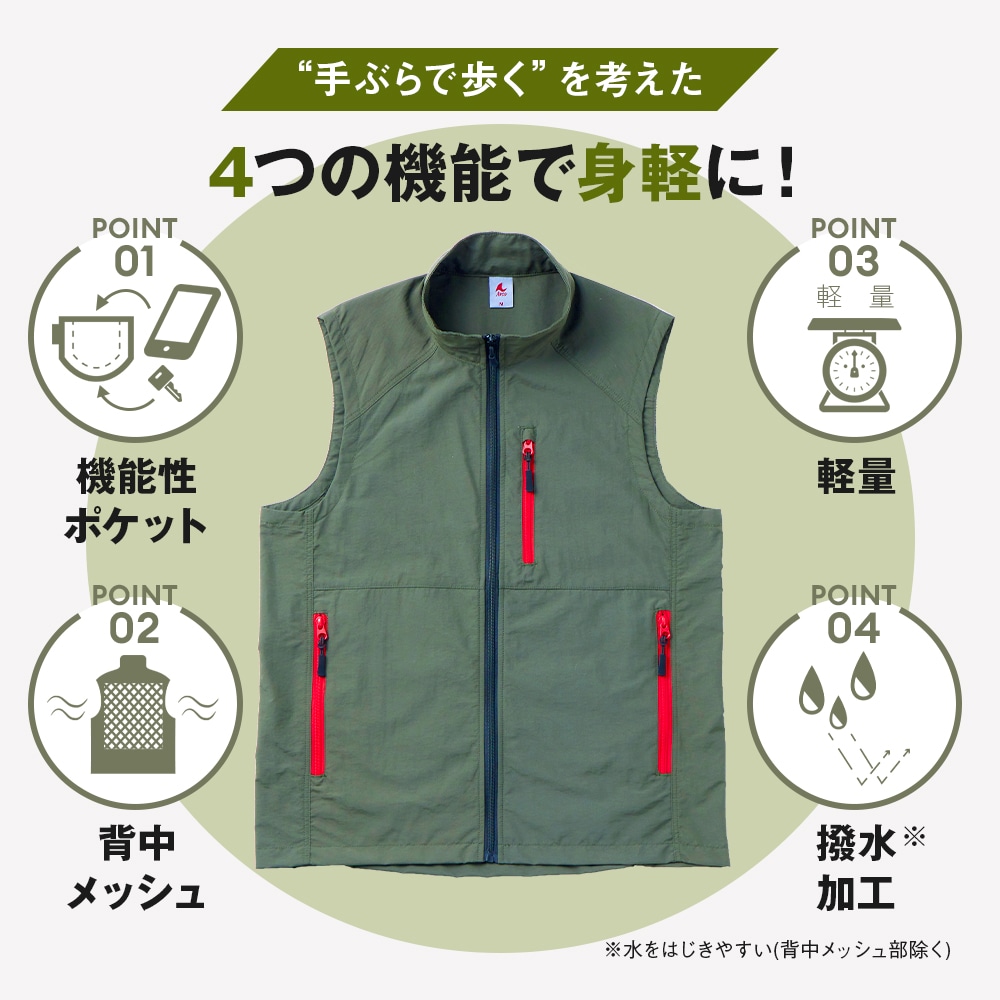 | 必需品を取り出しやすい機能性ポケットを備えた、手ぶらで歩ける機能ベスト。3箇所のポケットはジッパー式なので中身が落ちにくく、スマホや小銭財布、鍵などの収納に便利。軽量で通気性がよく、撥水加工済(※メッシュ部分除く)。蒸れにくく軽い薄手のナイロン生地を使用し、背面はメッシュ素材だからリュックを背負ってもムレにくい設計。スッキリとしたシルエットで着ぶくれしにくいユニセックスデザインです。 |