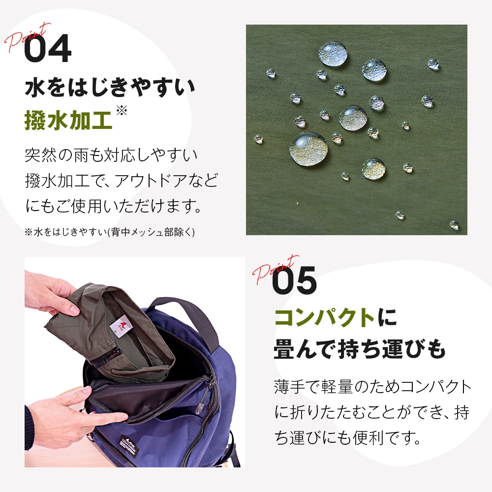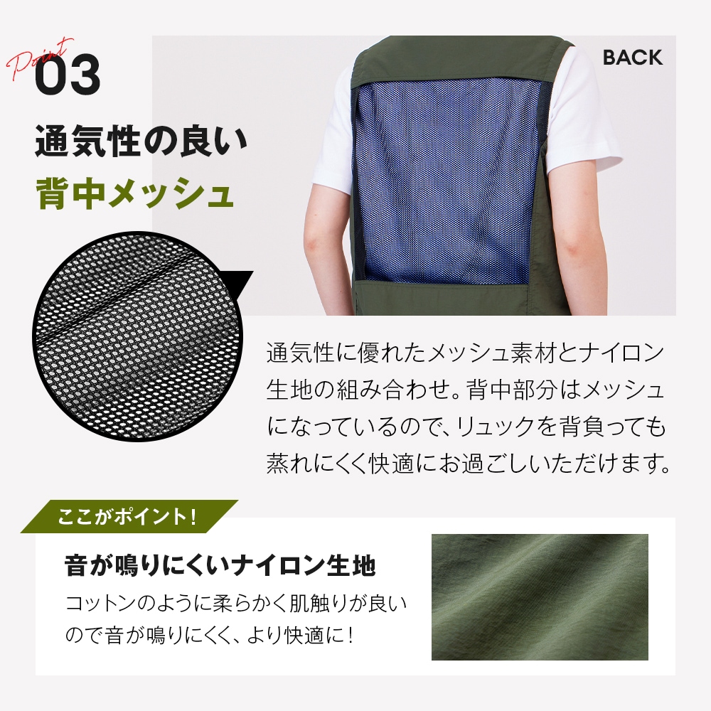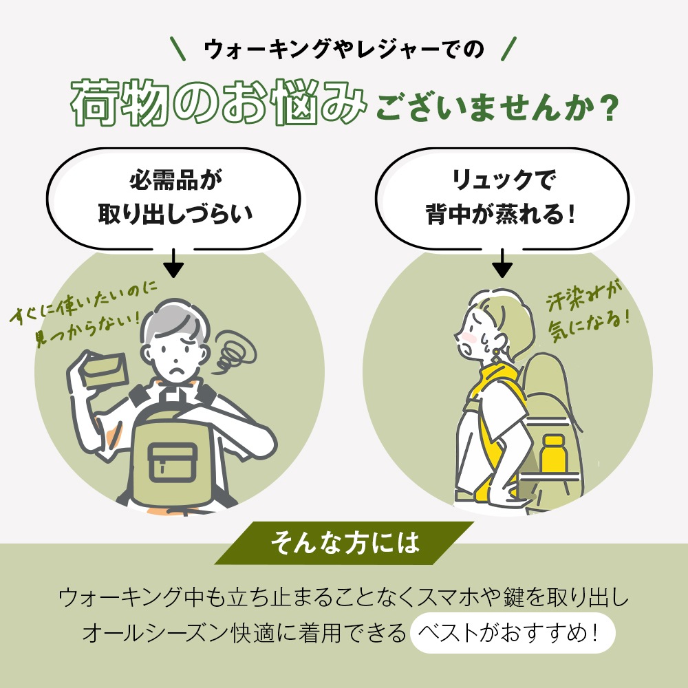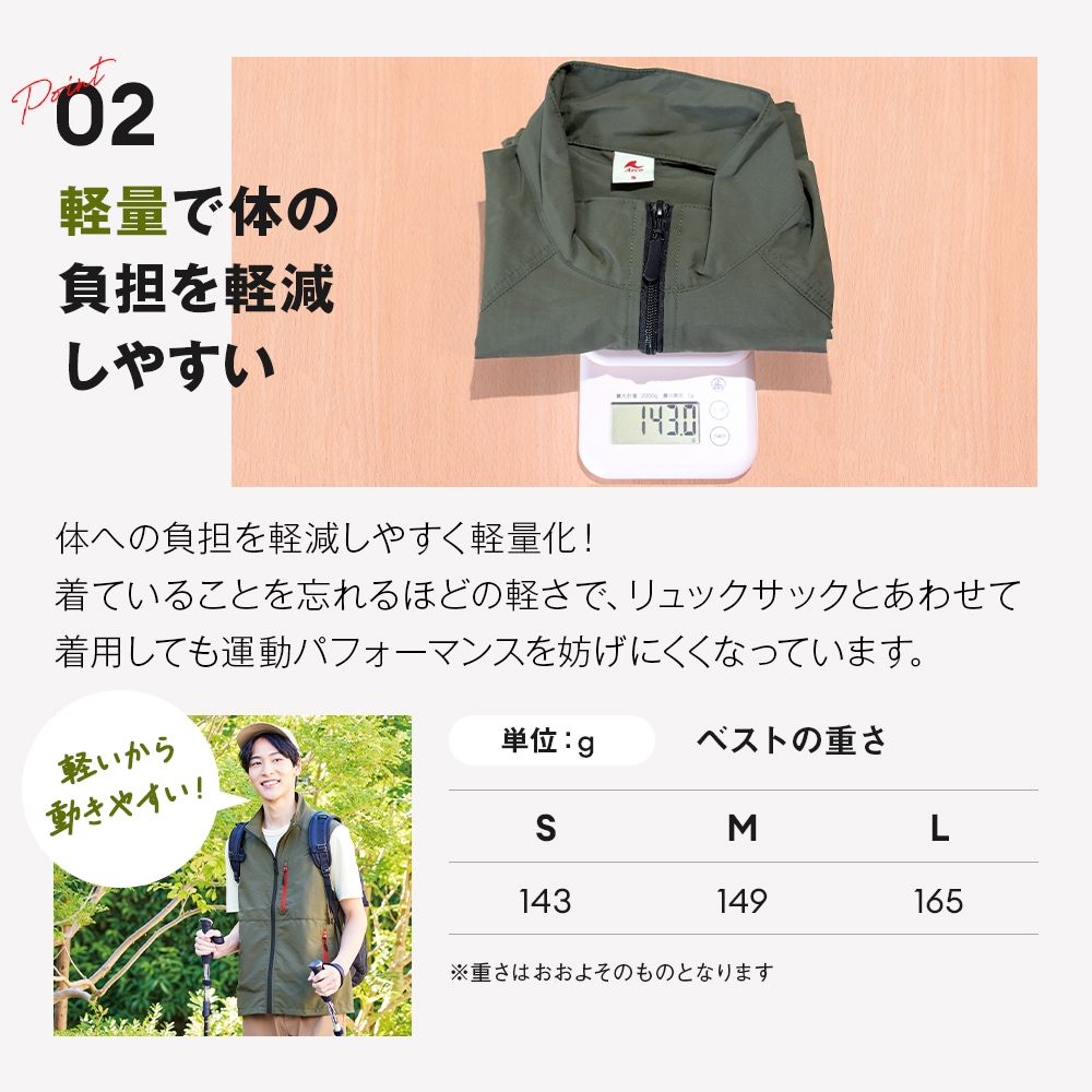 | 必需品を取り出しやすい機能性ポケットを備えた、手ぶらで歩ける機能ベスト。3箇所のポケットはジッパー式なので中身が落ちにくく、スマホや小銭財布、鍵などの収納に便利。軽量で通気性がよく、撥水加工済(※メッシュ部分除く)。蒸れにくく軽い薄手のナイロン生地を使用し、背面はメッシュ素材だからリュックを背負ってもムレにくい設計。スッキリとしたシルエットで着ぶくれしにくいユニセックスデザインです。 |