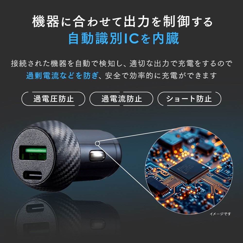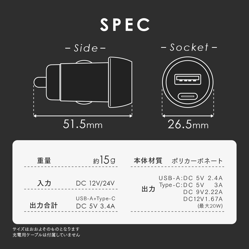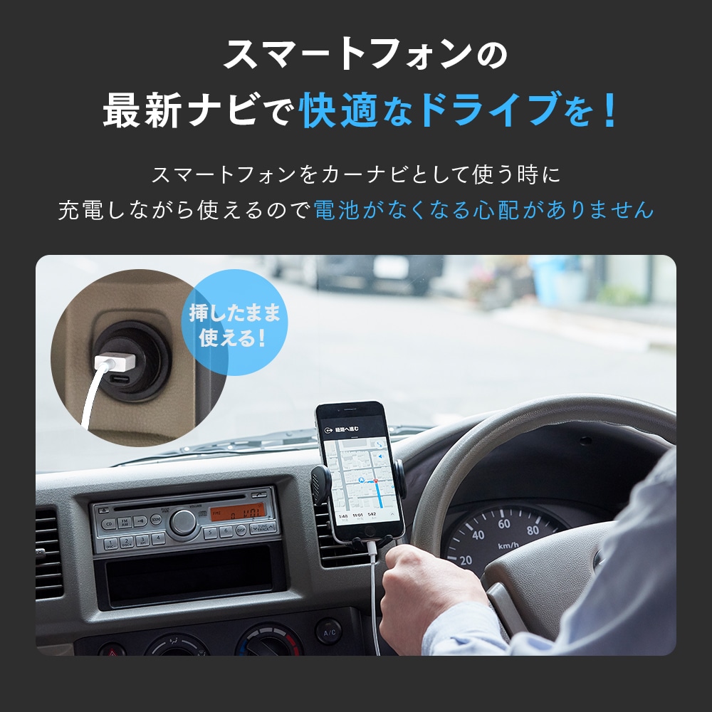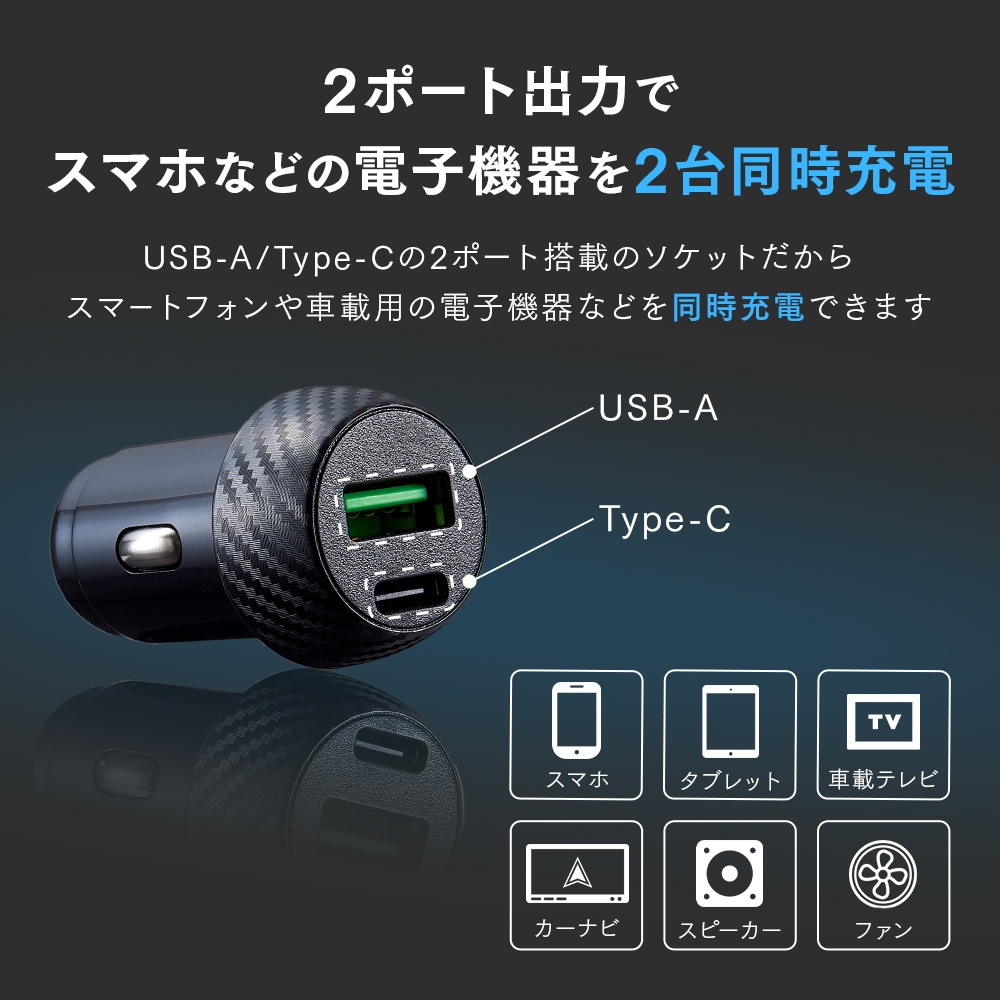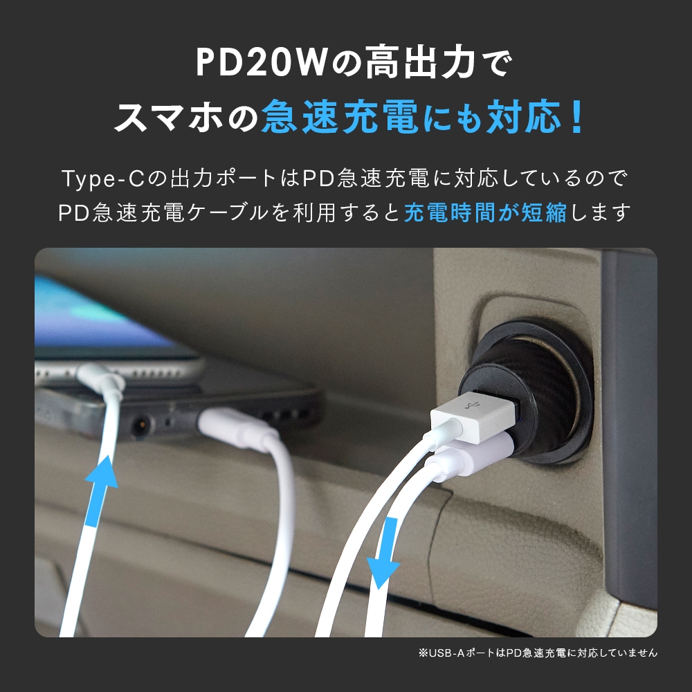 | 車のシガーソケットからスマホやタブレットを充電できる、充電アダプタ。USB-A/Type-Cの2ポート搭載で、2台同時充電も可能。Type-CポートはPD20Wの高出力でスマホの急速充電に対応。機器に合わせて出力を制御する自動識別IC内蔵。充電切れの心配をせずに、スマートフォンの最新ナビで快適なドライブを! |