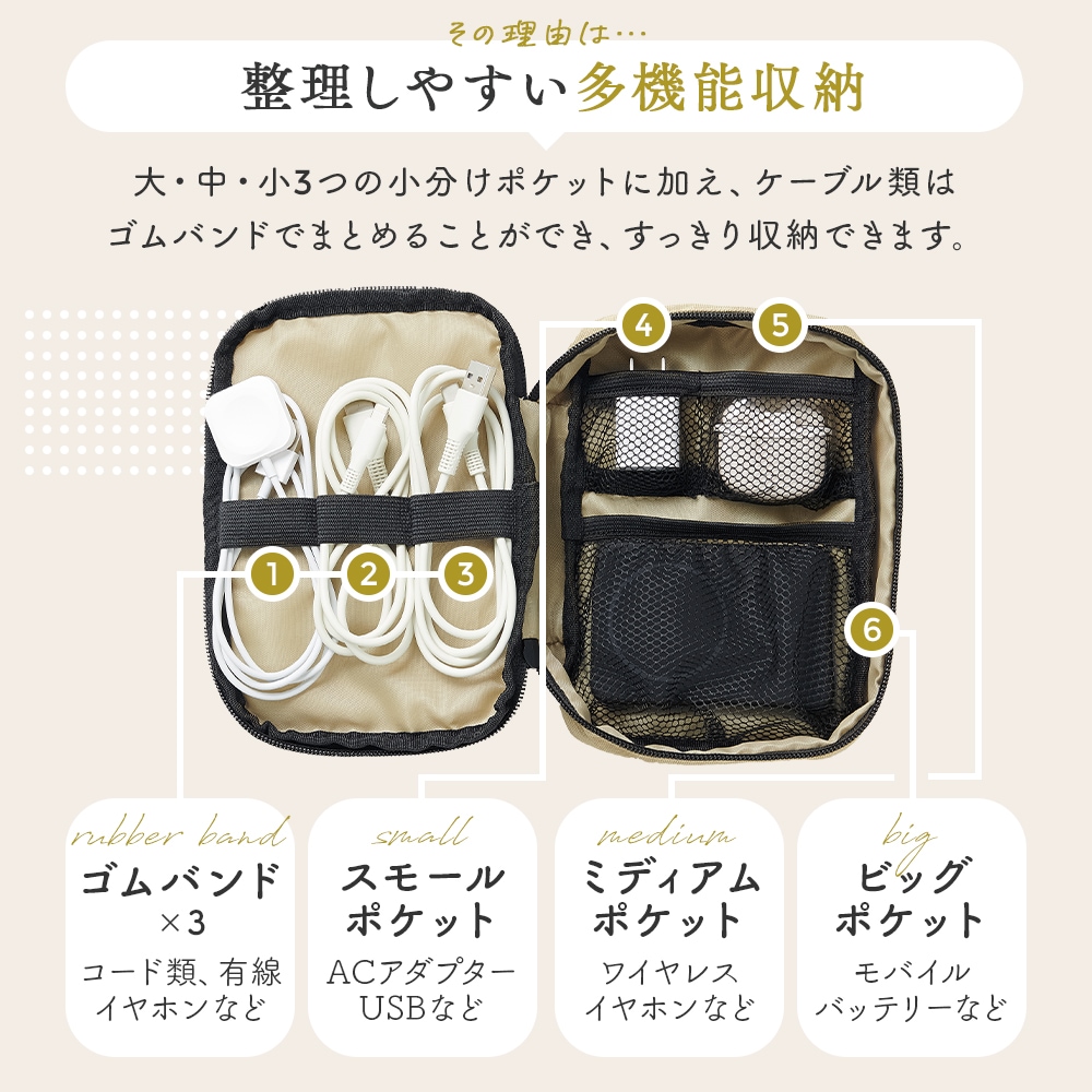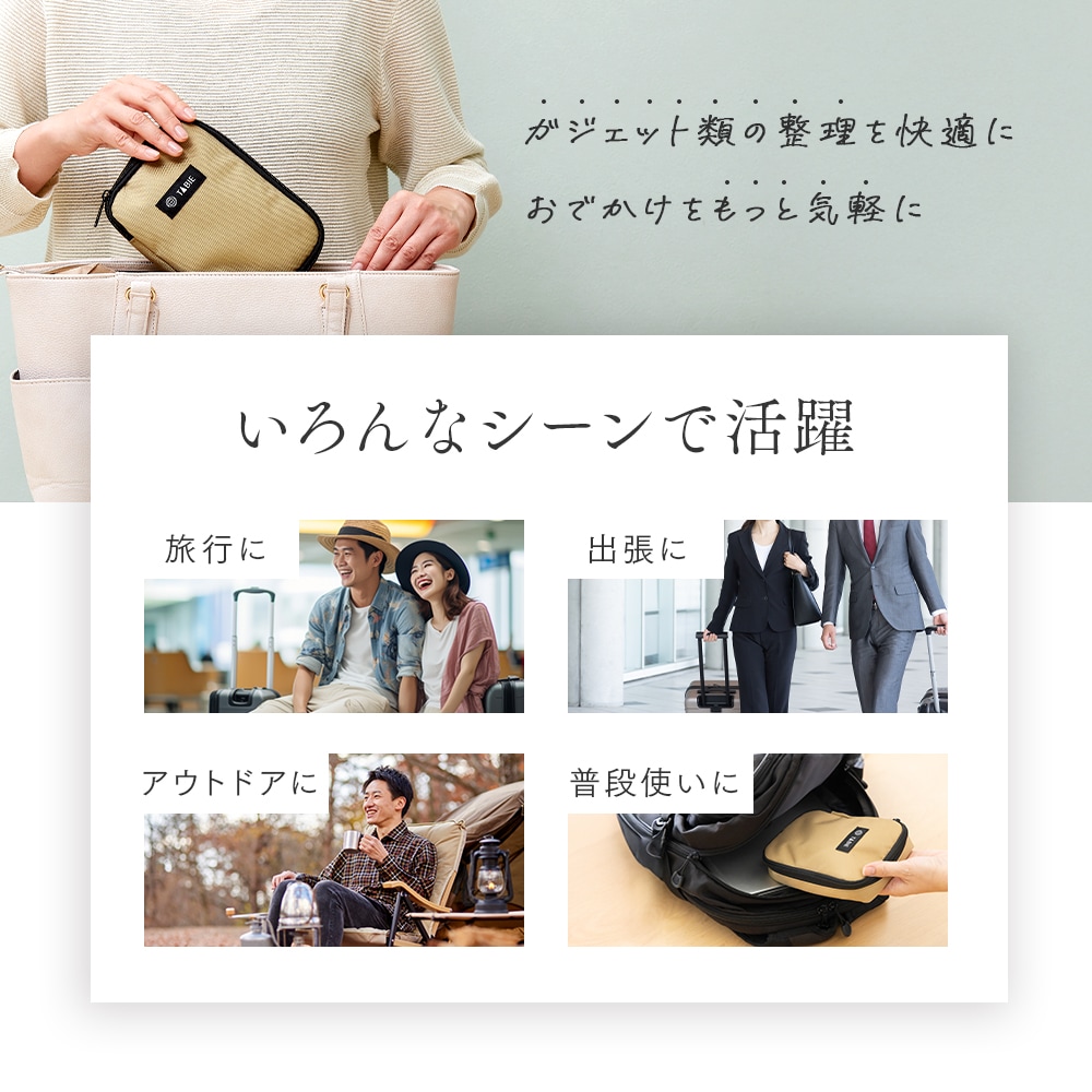 スマホ周りのコードや充電器をひとまとめに!ガバッと開いて必要なものをサッと取り出せるポーチ。持ち運びやすいコンパクトサイズで、旅行・アウトドア・普段使いに。