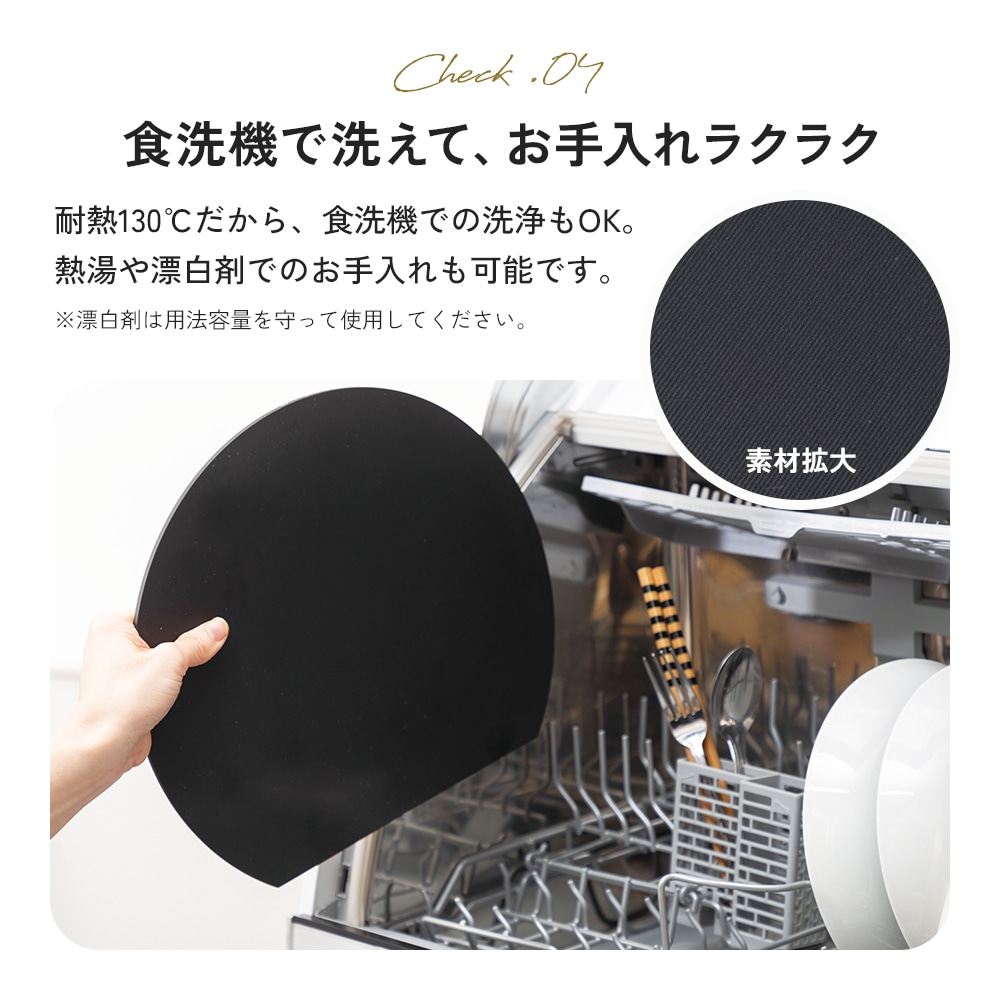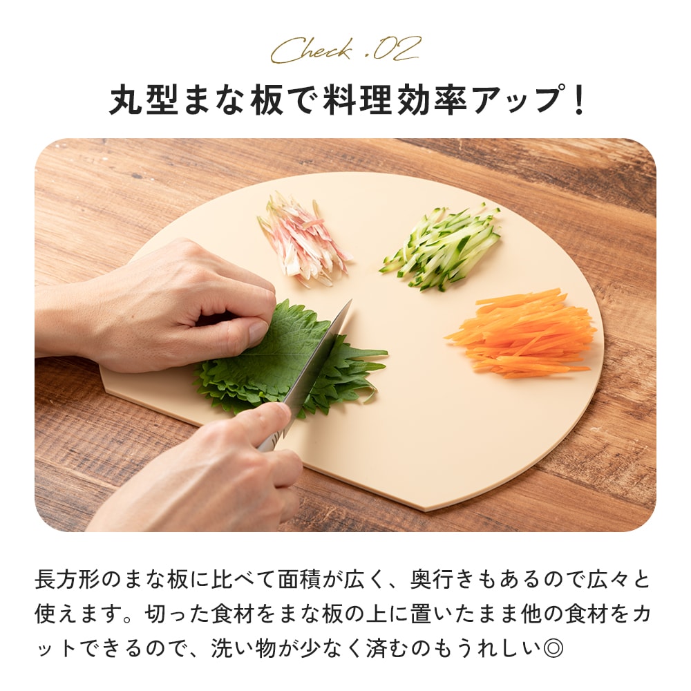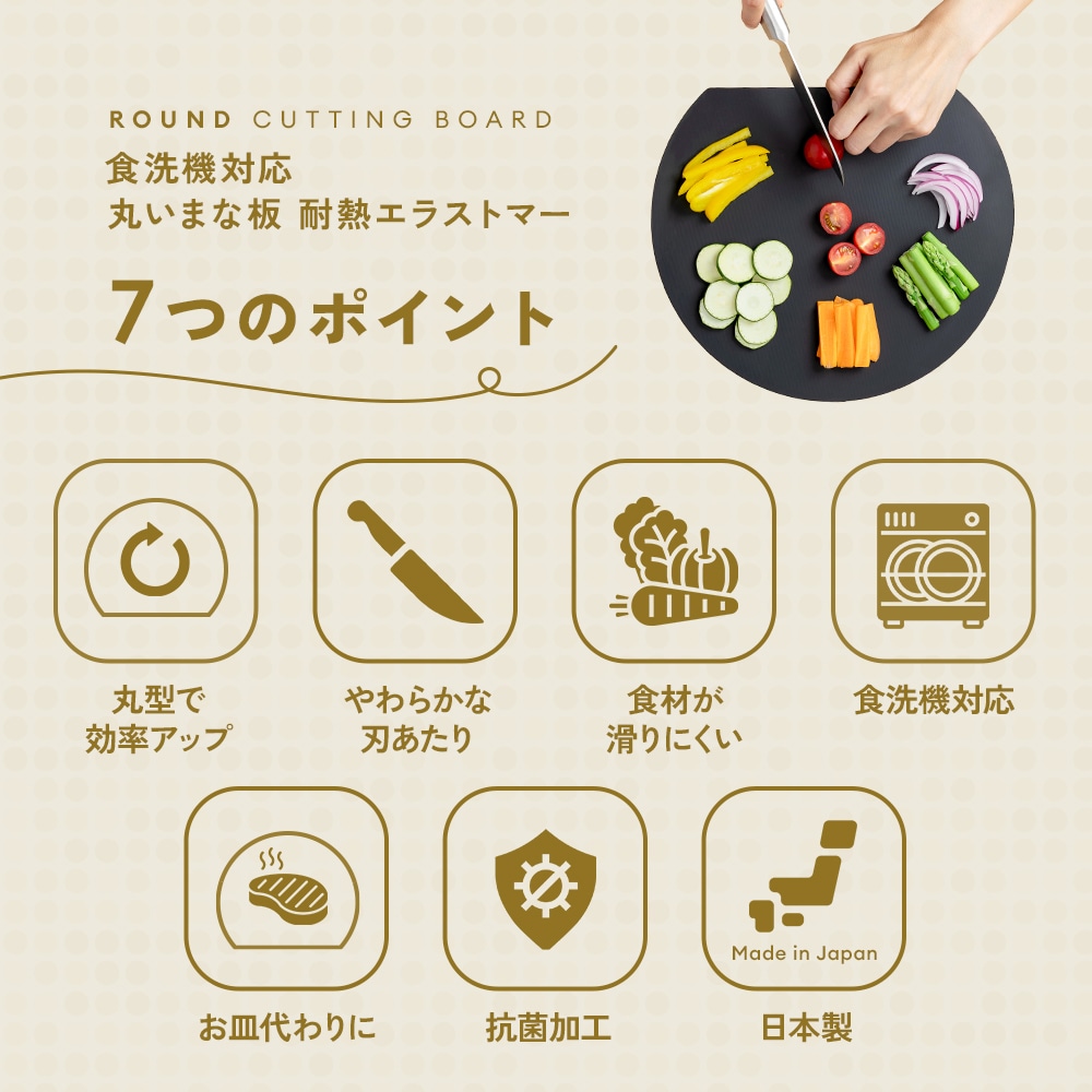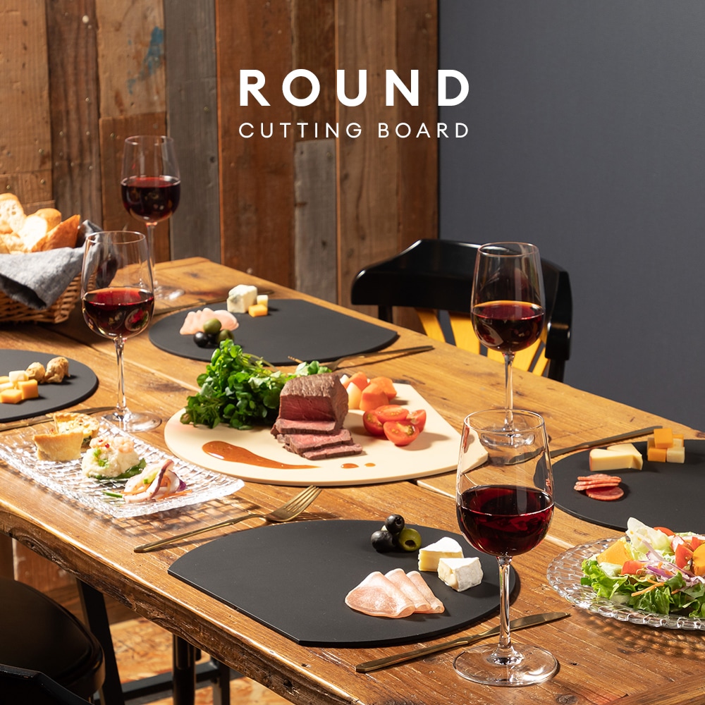 | 刃あたりが柔らかく食材がすべりにくい、弾力性のある日本製の耐熱エラストマーまな板。面積が広い丸形だから、カットした食材を並べて置いてお皿いらず!果物やパンなどちょっとした時の食材のカットに。熱湯消毒・食洗機使用OK。耐熱130℃、耐冷-30℃。 |