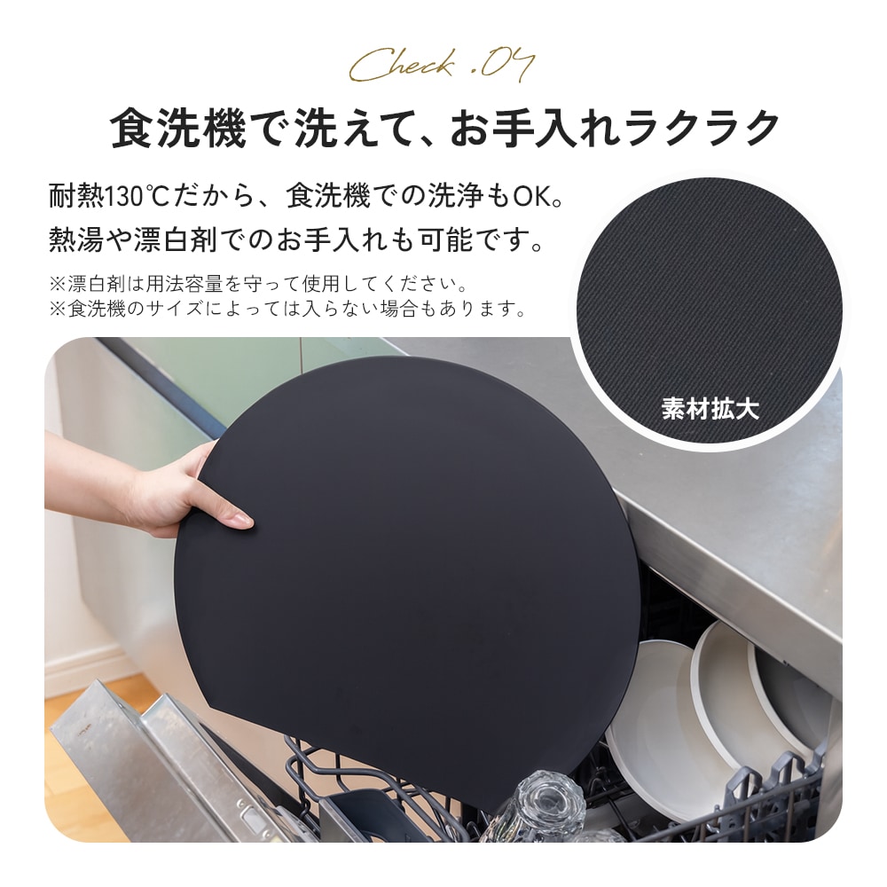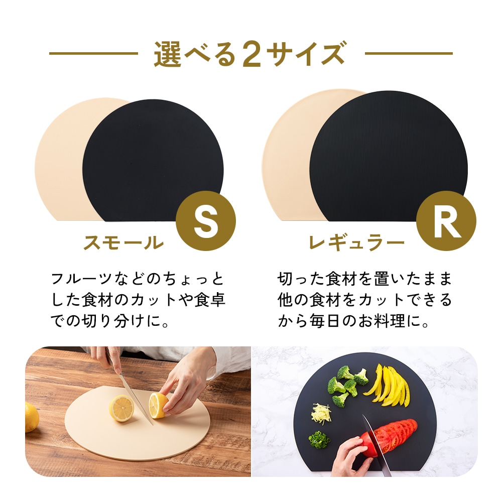 | 刃あたりが柔らかく食材がすべりにくい、弾力性のある日本製の耐熱エラストマーまな板。面積が広い丸形だから、カットした食材を並べて置いてお皿いらず!果物やパンなどちょっとした時の食材のカットに。熱湯消毒・食洗機使用OK。耐熱130℃、耐冷-30℃。 |