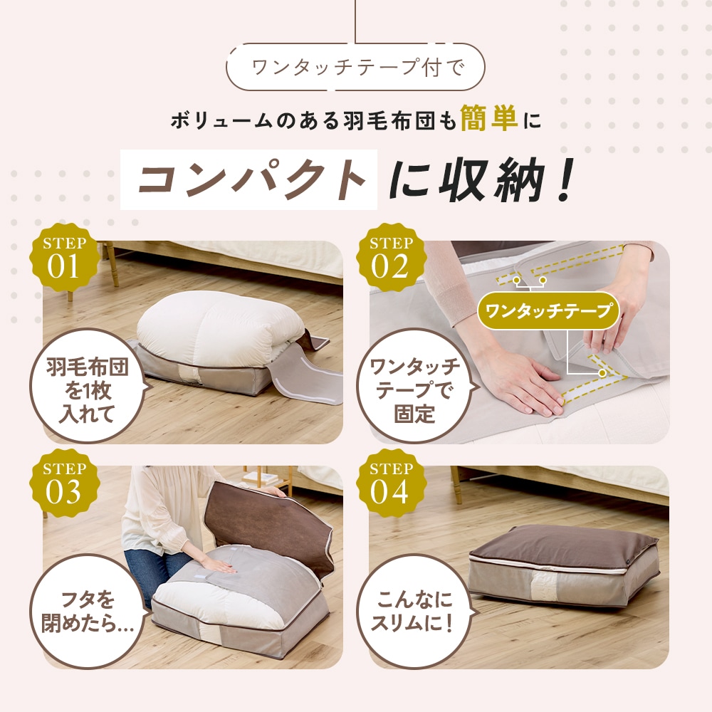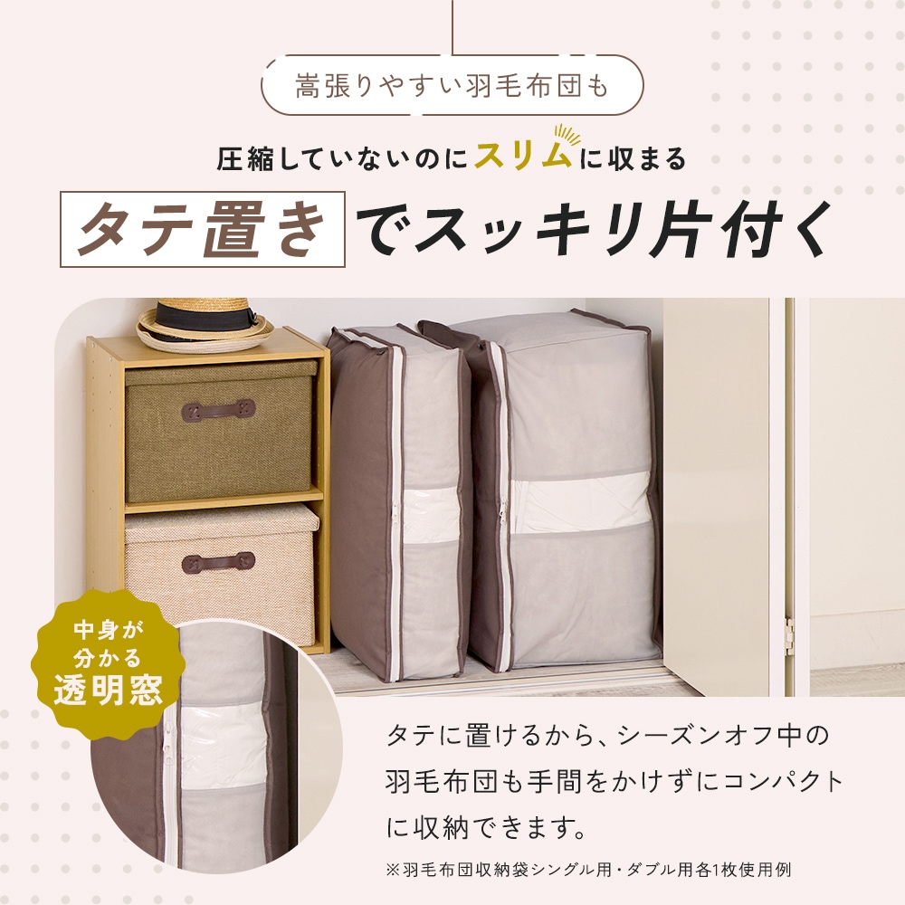 クローゼットのすき間にタテ収納!シングル用サイズの羽毛布団収納ケース。炭加工シートを挟んだ3層構造で、気になる汗のニオイ・加齢臭を消臭。幅広テープで手間をかけずにスッキリ収納できます。中身が分かる透明窓付き。普段使わない来客用の布団にも。