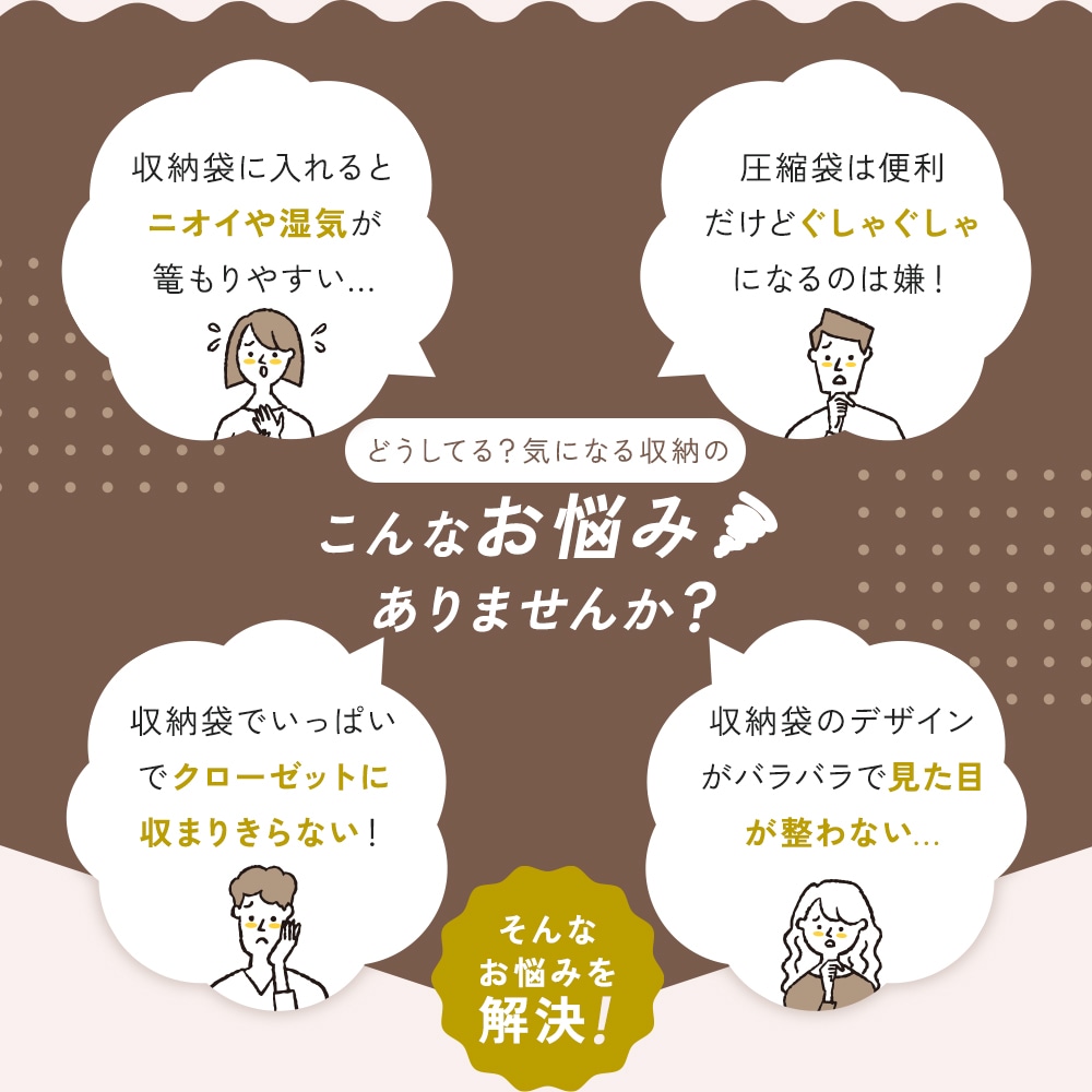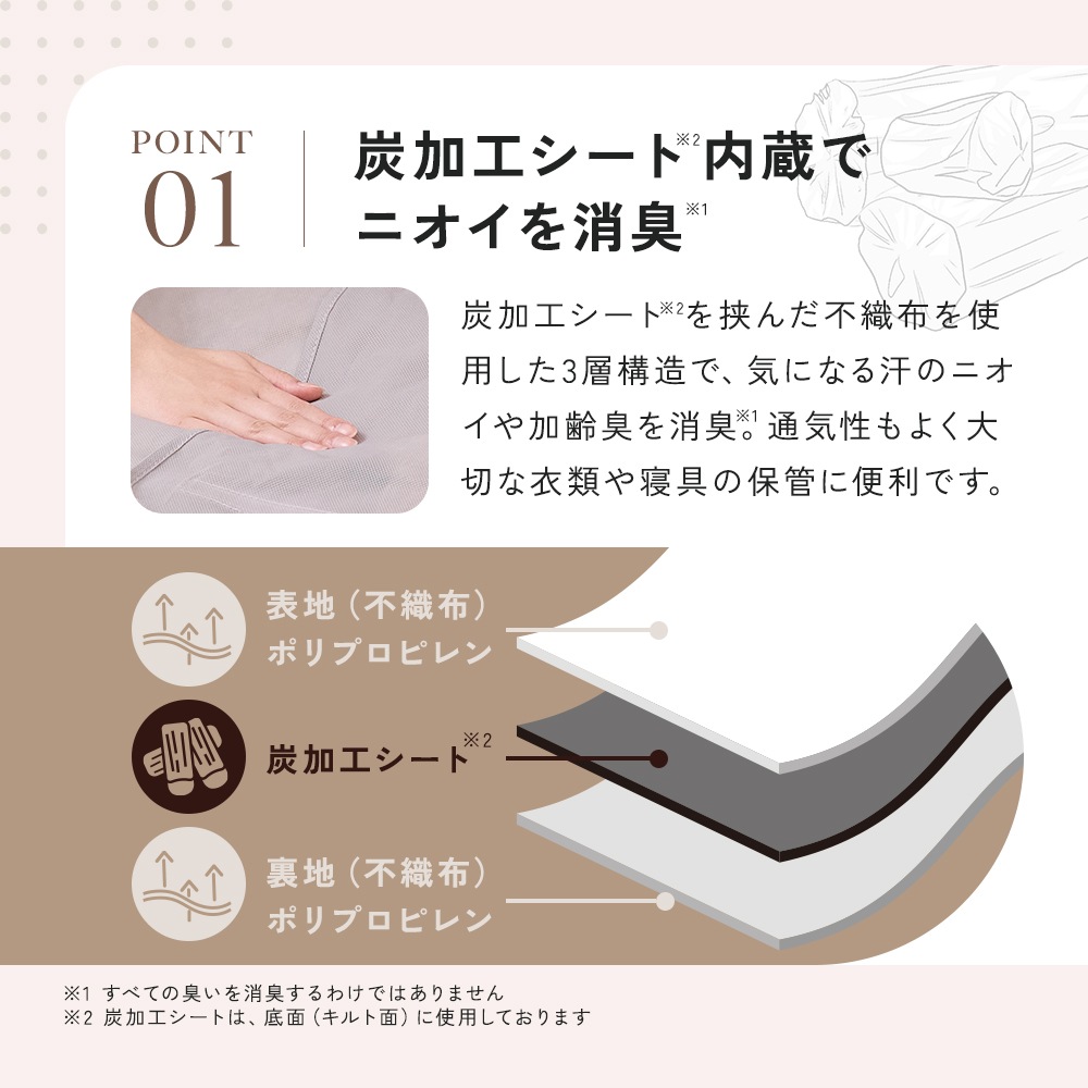 クローゼットのすき間にタテ収納!ダブル用サイズの羽毛布団収納ケース。炭加工シートを挟んだ3層構造で、気になる汗のニオイ・加齢臭を消臭。幅広テープで手間をかけずにスッキリ収納できます。中身が分かる透明窓付き。普段使わない来客用の布団にも。