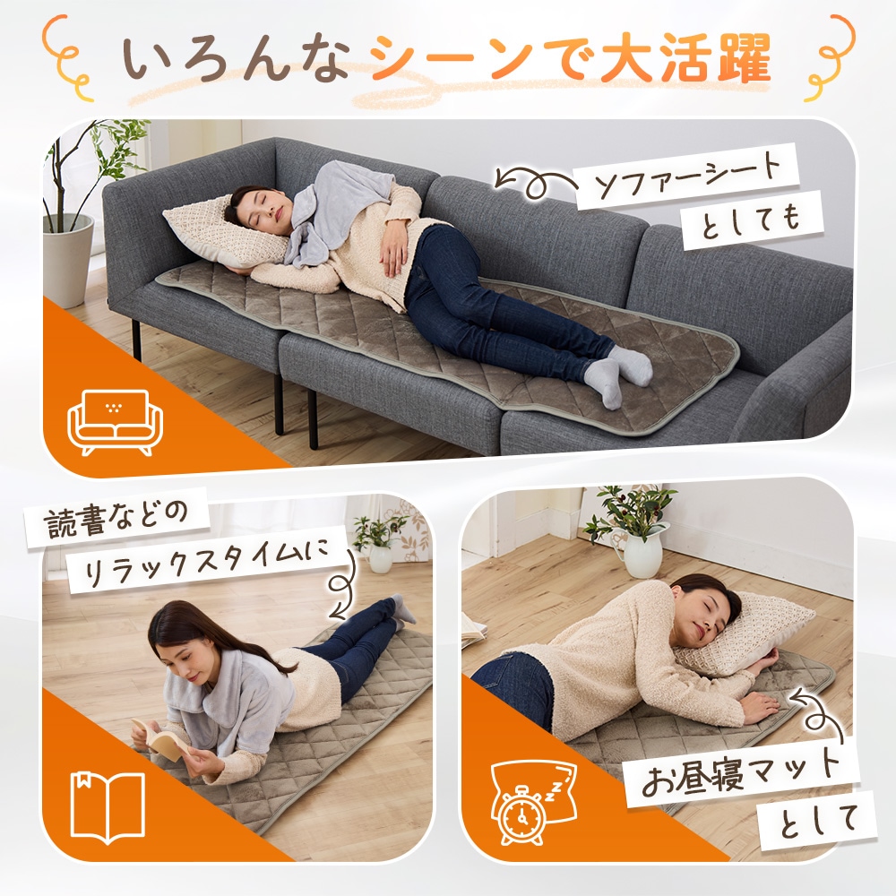 | ふわふわで滑らかな肌触りが心地よい、フランネル素材のごろ寝マット。フランネルの極細繊維が暖かい空気をたっぷり抱え込むから、床にそのまま敷くだけで冷気を遮り、ぽかぽか快適なくつろぎ空間に。軽くて持ち運びやすく、お手入れも簡単。ご家庭の洗濯機で洗えます。ソファーシートにも。 |